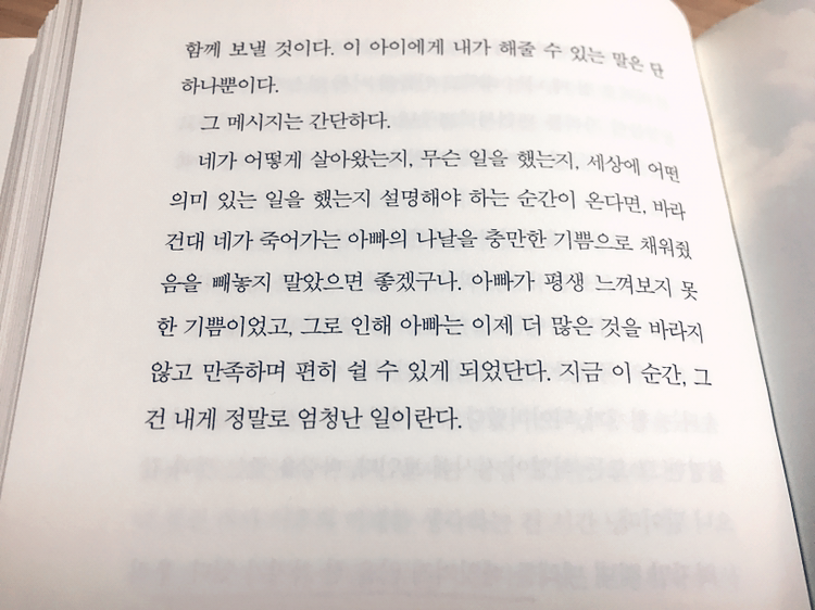 네가 어떻게 살아왔는지, 무슨 일을 했는지, 세상에 어떤 의미 있는 일을 했는지 설명해야 하는 순간이 온다면, 바라건대 네가 죽어가는 아빠의 나날을 충만한 기쁨으로 채워줬음을 빼놓지 말았으면 좋겠구나. 아빠가 평생 느껴보지 못한 기쁨이었고, 그로 인해 아빠는 이제 더 많은 것을 바라지 않고 만족하며 편히 쉴 수 있게 되었단다. 지금 이 순간, 그건 내게 정말로 엄청난 일이란다. - p234