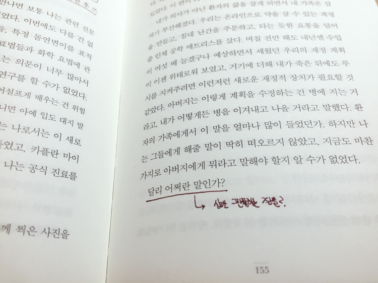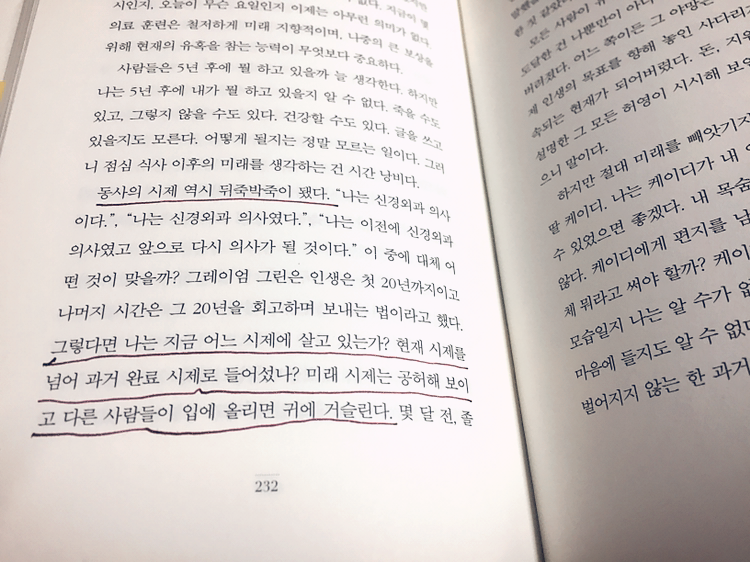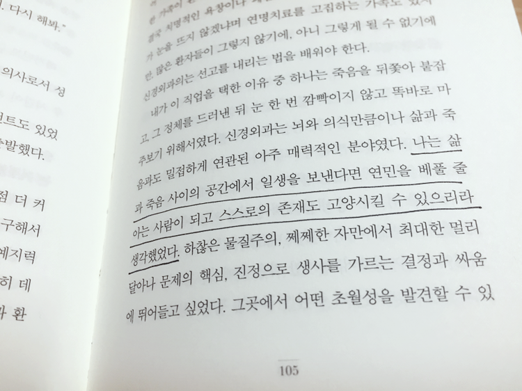 애써 외면한 시간의 유한함에 대해 눈을 뜨게 한다. 그것도 누구도 준비가 안되어 있는 상태로 급작스럽게 말이다. 자칫 허무주의와 원망만이 남을 수 있는 이때, 폴 칼라니티는 아래와 같이 이야기한다.