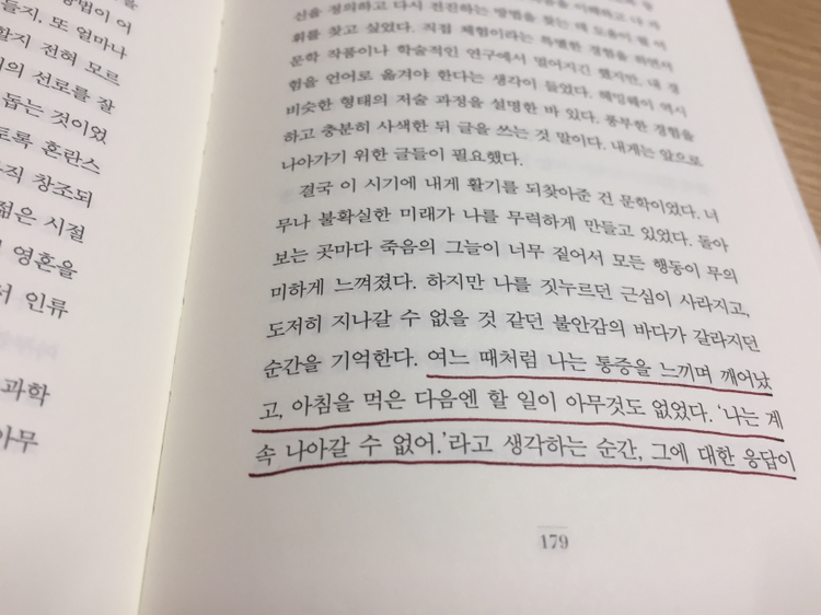 여느 때처럼 나는 통증을 느끼며 깨어났고, 아침을 먹은 다음엔 할 일이 아무것도 없었다. '나는 계속 나아갈 수 없어.'라고 생각하는 순간, 그에 대한 응답이 떠올랐다. 그건 내가 오래전 학부 시절 배웠던 사뮈엘 베케트의 구절이기도 했다. "그래도 계속 나아갈 거야." 나는 침대에서 나와한 걸음 앞으로 내딛고는 그 구절을 몇 번이고 반복했다. - p179