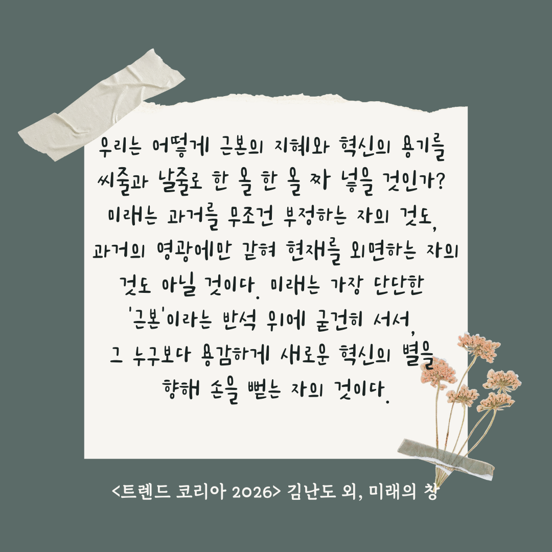 근본이즘 트렌드 아래서 시간이 감옥이 되지 않으려면, 과거와 미래 중 하나를 선택하는 것이 아니라, 그 둘을 어떻게 현명하게 조화시킬 것인가를 더 고민해야 한다. 우리는 어떻게 기술적으로 진보하면서도 시대를 초월하는 가치에 깊이 뿌리내린 미래를 건설할 것인가? 우리는 어떻게 근본의 지혜와 혁신의 용기를 씨줄과 날줄로 한 올 한 올 짜 넣을 것인가? 미래는 과거를 무조건 부정하는 자의 것도, 과거의 영광에만 갇혀 현재를 외면하는 자의 것도 아닐 것이다. 미래는 가장 단단한 ‘근본’이라는 반석 위에 굳건히 서서, 그 누구보다 용감하게 새로운 혁신의 별을 향해 손을 뻗는 자의 것이다.