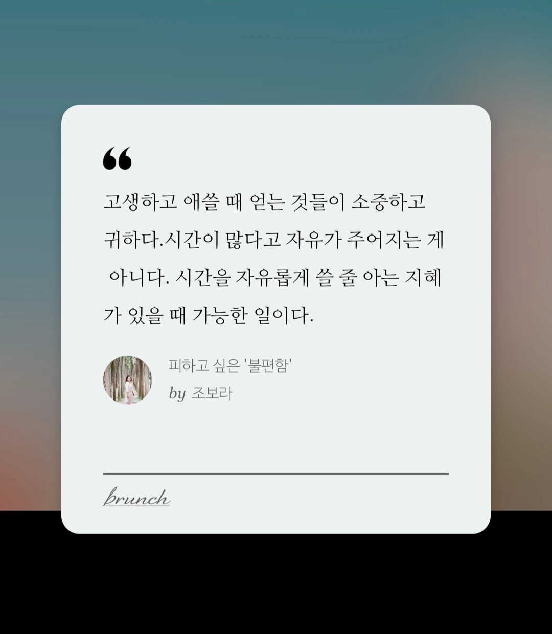 이 글을 시작할 때만 해도 나는 불편함이라고는 전혀 없이 편안함만 추구한다고 생각했다. 하지만 이렇게 글을 쓰다 보니, 작은 불편함 속에 나를 맡기고 있다. 내가 하기 싫고 귀찮은 일도 있고, 부담스러운 일들을 꾸준히 하고 있었다.