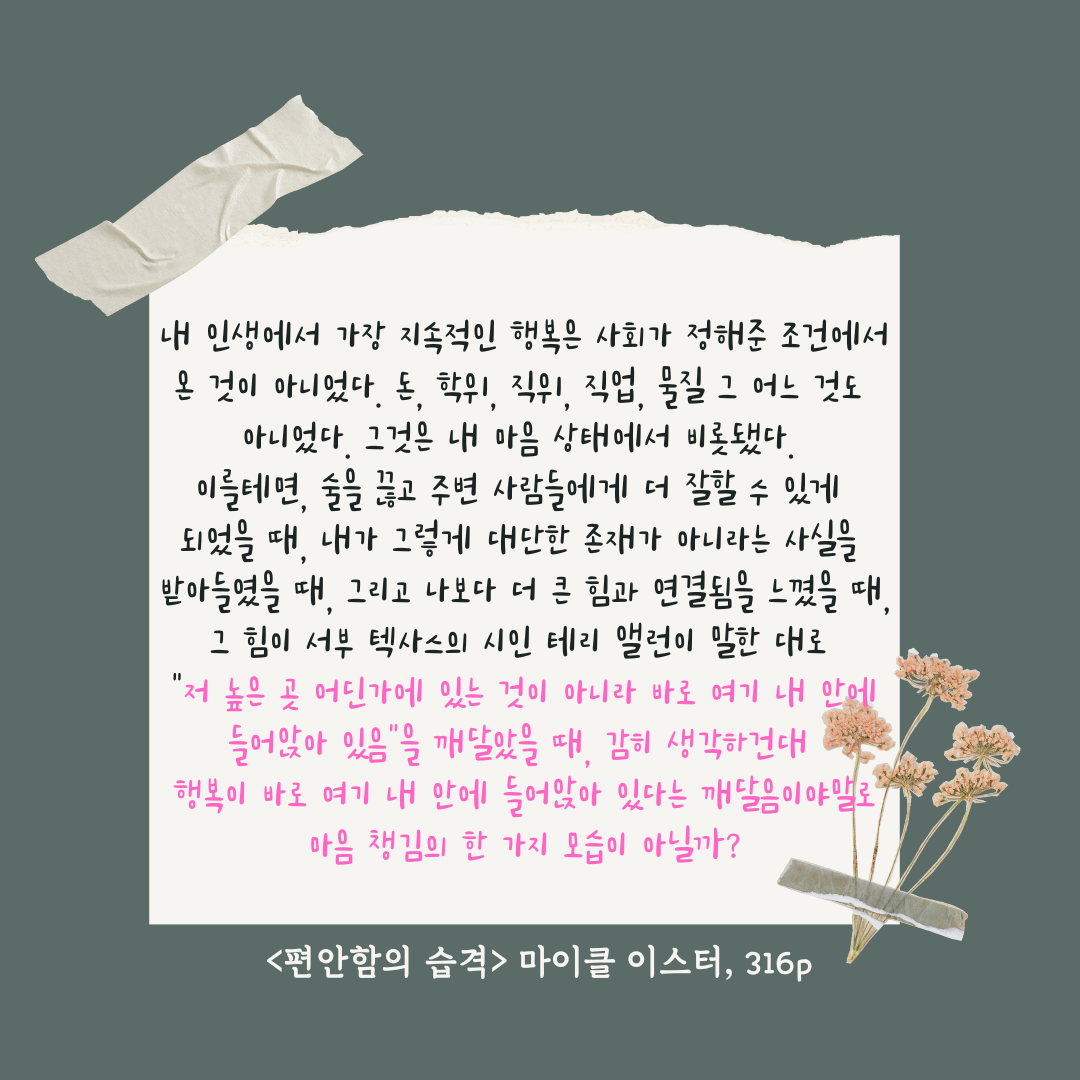 내 인생에서 가장 지속적인 행복은 사회가 정해준 조건에서 온 것이 아니었다. 돈, 학위, 직위, 직업, 물질 그 어느 것도 아니었다. 그것은 내 마음 상태에서 비롯됐다. 이를테면, 술을 끊고 주변 사람들에게 더 잘할 수 있게 되었을 때, 내가 그렇게 대단한 존재가 아니라는 사실을 받아들였을 때, 그리고 나보다 더 큰 힘과 연결됨을 느꼈을 때, 그 힘이 서부 텍사스의 시인 테리 앨런이 말한 대로 "저 높은 곳 어딘가에 있는 것이 아니라 바로 여기 내 안에 들어앉아 있음"을 깨달았을 때, 감히 생각하건대 행복이 바로 여기 내 안에 들어앉아 있다는 깨달음이야말로 마음 챙김의 한 가지 모습이 아닐까? <편안함의 습격> 마이클 이스터, 수오서재 316p