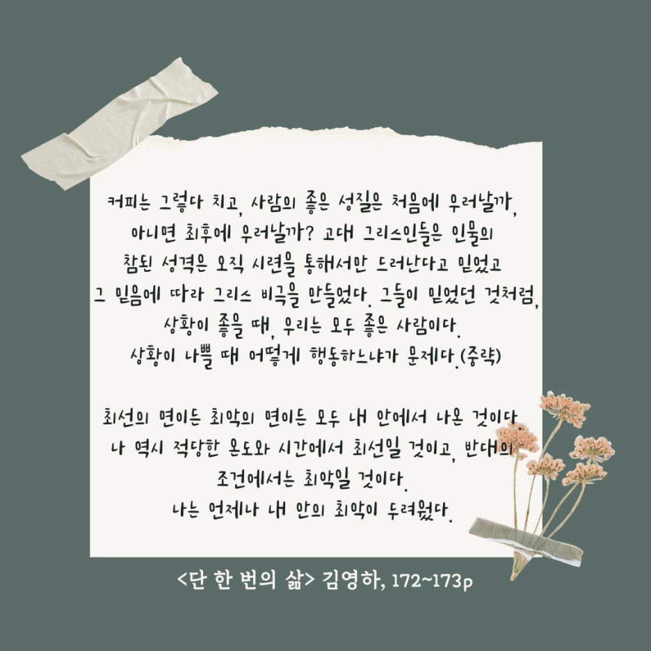최선뿐 아니라 최악의 모습이 내 안에 있음을 인정하고 받아들인다. 중요한 것은 두려움 속에서도 나 자신을 잃지 않고 상황이 어려울 때조차 존중과 성실을 선택하는 것이다. 그 선택이 결국 나를 나답게 만들고 나를 더 단단하게 만들리라. 이런 힘으로 다른 사람을 존중하며 살고 싶다.
