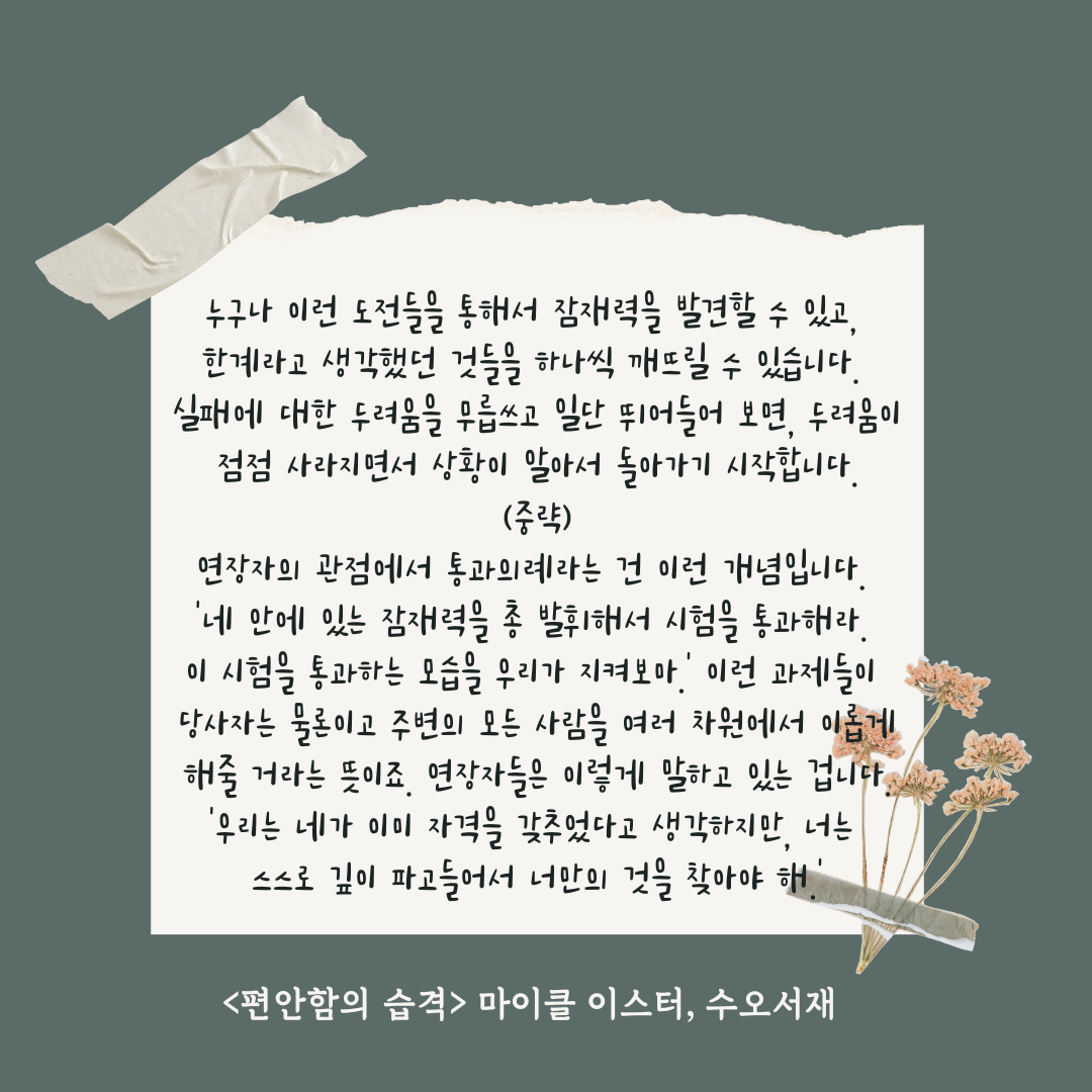 연장자의 관점에서 통과의례라는 건 이런 개념입니다. '네 안에 있는 잠재력을 총 발휘해서 시험을 통과해라. 이 시험을 통과하는 모습을 우리가 지켜보마.' 이런 과제들이 당사자는 물론이고 주변의 모든 사람을 여러 차원에서 이롭게 해 줄 거라는 뜻이죠. 연장자들은 이렇게 말하고 있는 겁니다. '우리는 네가 이미 자격을 갖추었다고 생각하지만, 너는 스스로 깊이 파고들어서 너만의 것을 찾아야 해.' <편안함의 습격> 마이클 이스터, 수오서재 107p