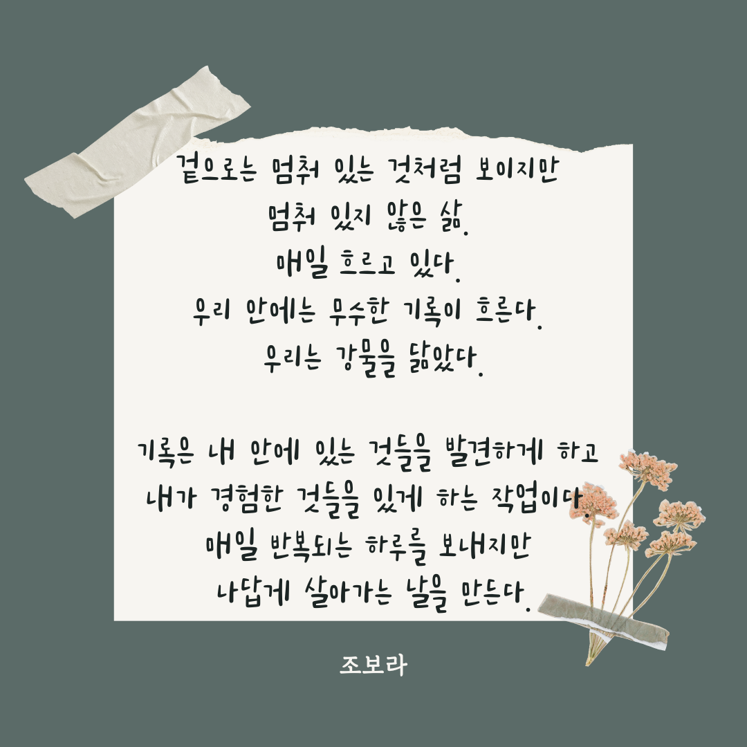 기록은 내 안에 있는 것들을 발견하게 하고 내가 경험한 것들을 있게 하는 작업이다. 매일 반복되는 하루를 보내지만 나답게 살아가는 날을 만든다.