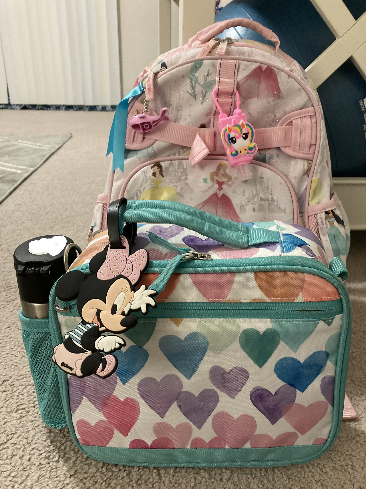 가방에 아이가 좋아할 만한 손소독제 통을 달아주고, 손 세정제도 가득 담아주었다.