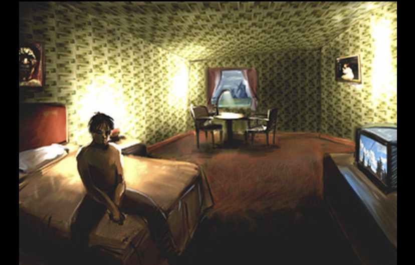 영문도 모른 채 감금된 지 1년이 지났을 무렵부터 그는 서서히 미쳐갑니다. 식사는 항상 같은 중국집의 군만두, 할 수 있는 것은 독방에서 텔레비전을 보는 것 밖에 없습니다. 가끔 독방에 수면가스가 퍼지고 깨어나보면 청소와 이발이 되어 있습니다.