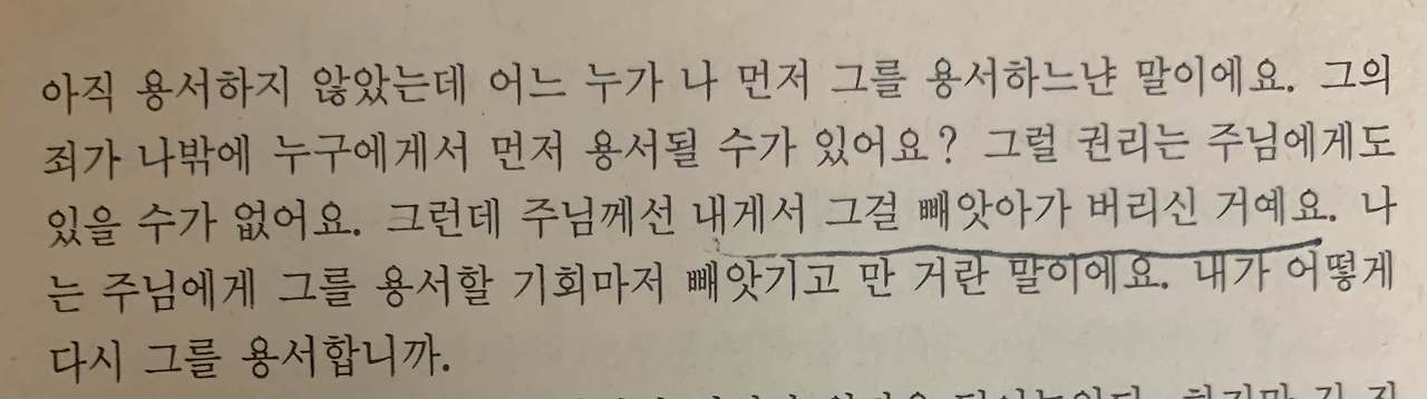 이창동 감독의 영화 밀양을 본 후 원작소설을 찾아보았습니다. 절판되고 오래된 중고서적을 구해 읽은 것입니다. 그래서 밑줄 친 부분은 제가 한 것이 아닙니다. 읽어 주셔서 감사합니다. 출처는 제 개인 블로그입니다.