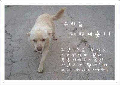 그 시절 우리 집은 한우를 키웠는데 아이들 학교 문제로 조금 떨어진 곳으로 이사를 해야만 했기에 그 집에 들어올 사람에게 해피를 부탁하고 녀석을 쓰다듬으며 달래듯 말을 해줬다. “해피야 미안해. 소들이 여기 있으니 날마다 너를 보러 올 거야. 축사에 쥐들이 많아서 너는 이곳에 있어야만 해~!! 서운해하지 마라. 알았지?!” 그리고 무심하게도 나는 해피를 까마득히 잊고 있었다. 이삿짐 정리를 했고 할 일도 많았고 개는 집을 지키는 동물로만 생각을 했었으니까... 그러다 바뀐 집주인에게서 연락이 왔다. 우리가 이사를 간 후로 녀석은 짚더미 속에서 밥을 굶으며 절대 나오질 않는다는 것이었다. 아이들이 다가갈라치면 이빨을 드러내며 으르렁거려서 데려갔으면 한다는 전화였다. ‘그랬었구나...’ 나는 득달같이 달려가서 열흘만에 녀석을 품에 안았는데 그새 해피의 몸은 거칠고 앙상해져 있었다.