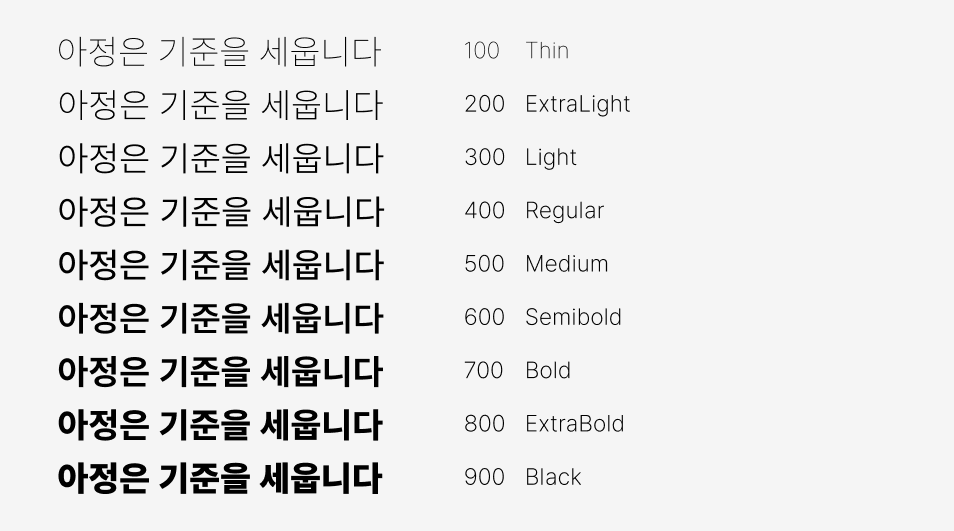 장점이자 단점인 것 같습니다. 다양한 사이즈여서 좋지만 UI/UX 디자인에서는 글꼴을 최대 3가지(사이즈 포함)를 넘기지 말아야 한다는 가이드가 있습니다. 그래서 초기 디자인 가이드를 잡을 때 몇 가지를 쓸 것인지 고민을 해야 했습니다. 저 같은 경우에는 regular, semibold, bold 이렇게 3가지만 사용합니다. 그런데 쓰다 보니 medium과 semibold가 헷갈리더라구요. 입맛에 따라 사용하시면 되겠습니다.