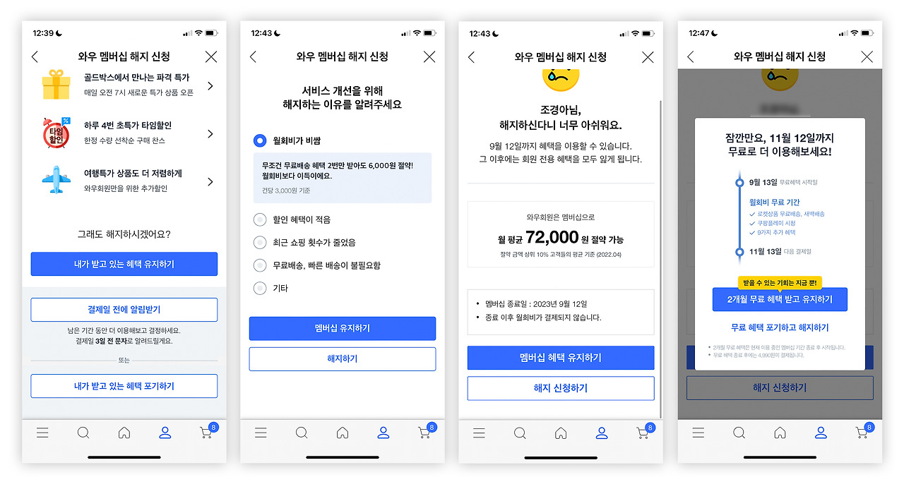 쿠팡도 와우멤버십을 해지하려면 들숨날숨을 고르면서 마음의 준비를 해야한다. 멤버십 해지뿐만 아니라 꽤 많은 다크패턴들이 존재한다. 필자는 멤버십을 해지하려다 유지하기를 터치해버려서 처음부터 다시 해지진행을 해야했다. 셋째 아이도 다운펌약을 990원 판매한대서 구매버튼을 눌렀다가 그만 와우 멤버십에 가입이 되어버렸다고 한다. 이건 뭐 거의 싸우자는건가 싶다.
