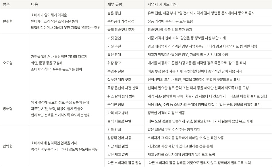 공정거래위원회는 몇 년간의 지속적인 규제 필요성과 중요성을 언급하며, 규제 환경 조성 및 집행의 움직임을 보이고 있다가 드디어 2023년 7월 31일 '온라인 다크패턴 자율관리 가이드라인 제정'을 공표했다.
