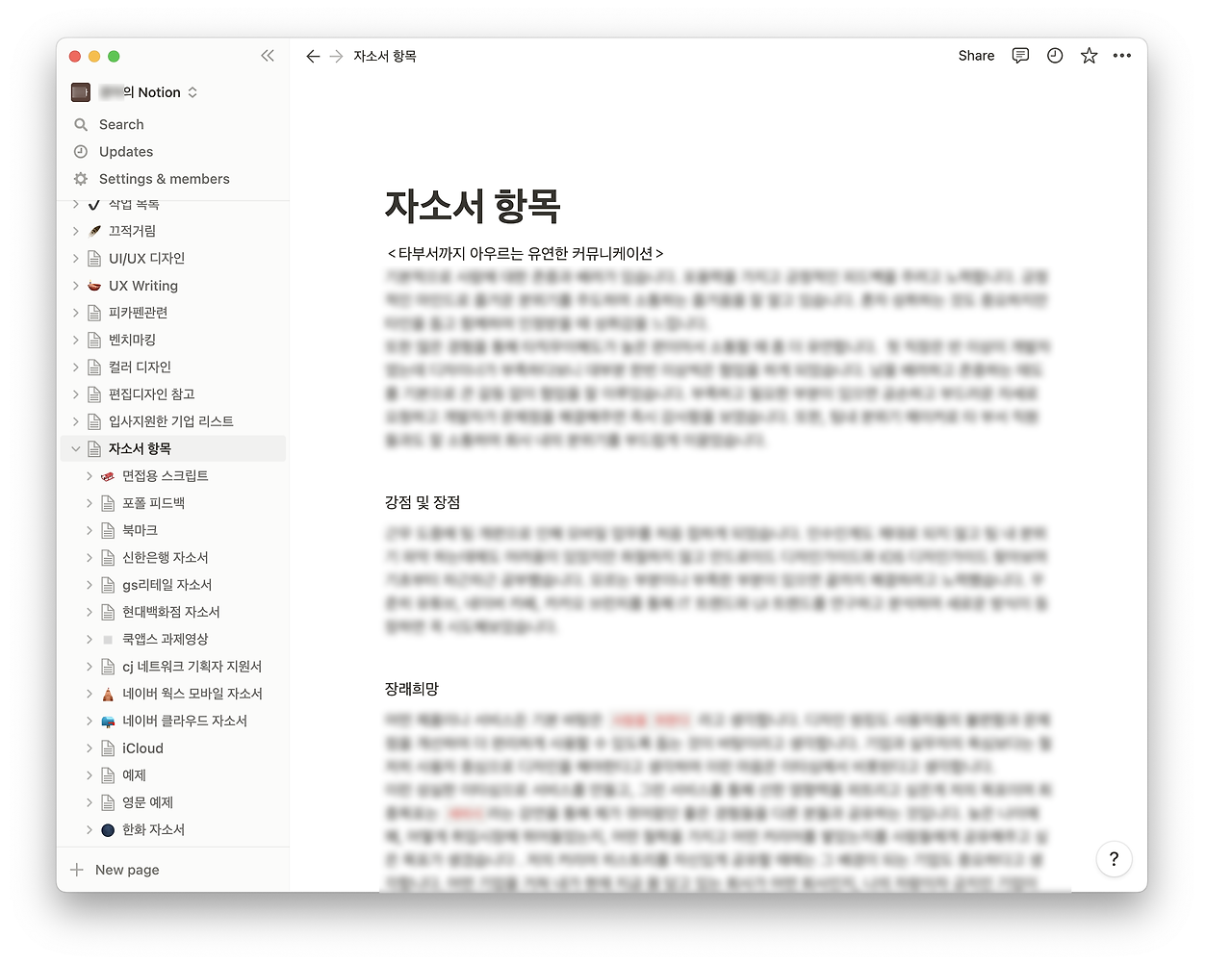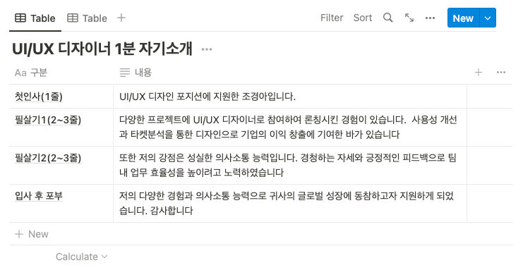 이 시간은 보통 아이스브레이킹이나 지원서를 훑어보기 위한 시간이다. 절대로 필요한 시간이다. 한참 면접을 보러 다녔던 때 노션에 정리해놓고 옆구리만 찔러도 술술 나올 정도로 외웠던 스크립트다. 면접왕 이형의 1분 자기소개 영상을 참고해서 만들었다. 필사기 2개 필수 장착. 정말 이형 영상은 취준생 필수 영상이다. 두 번 보세요. 세 번 보세요!