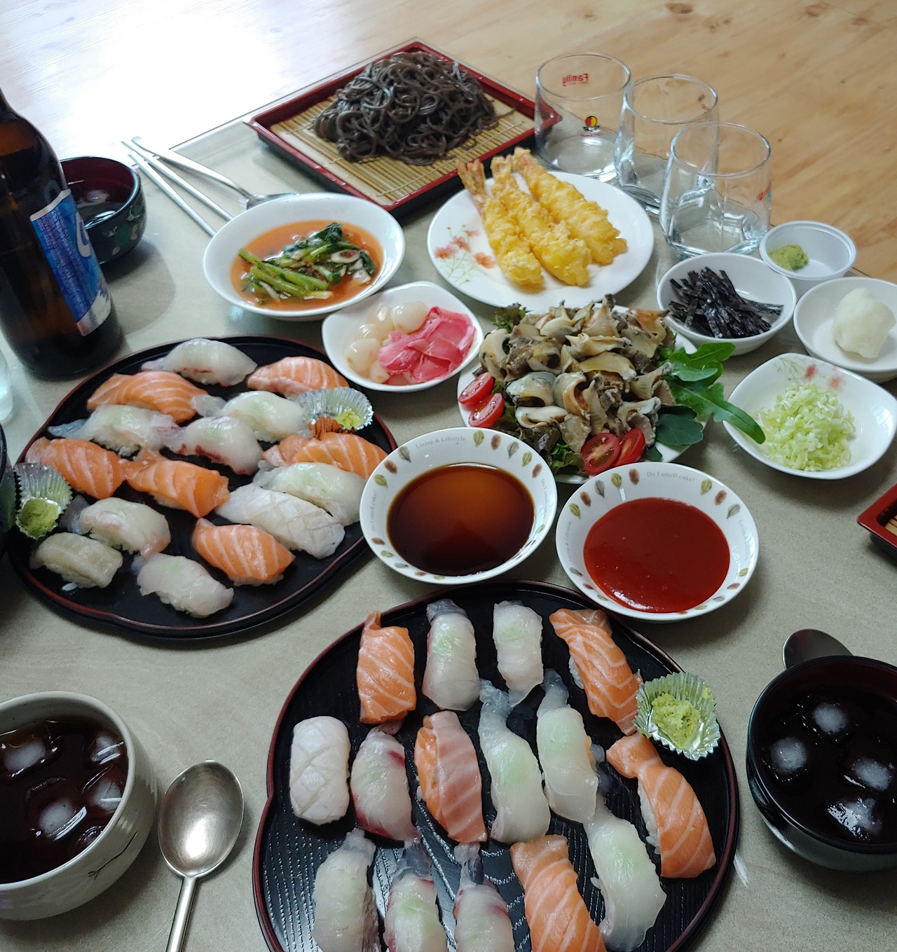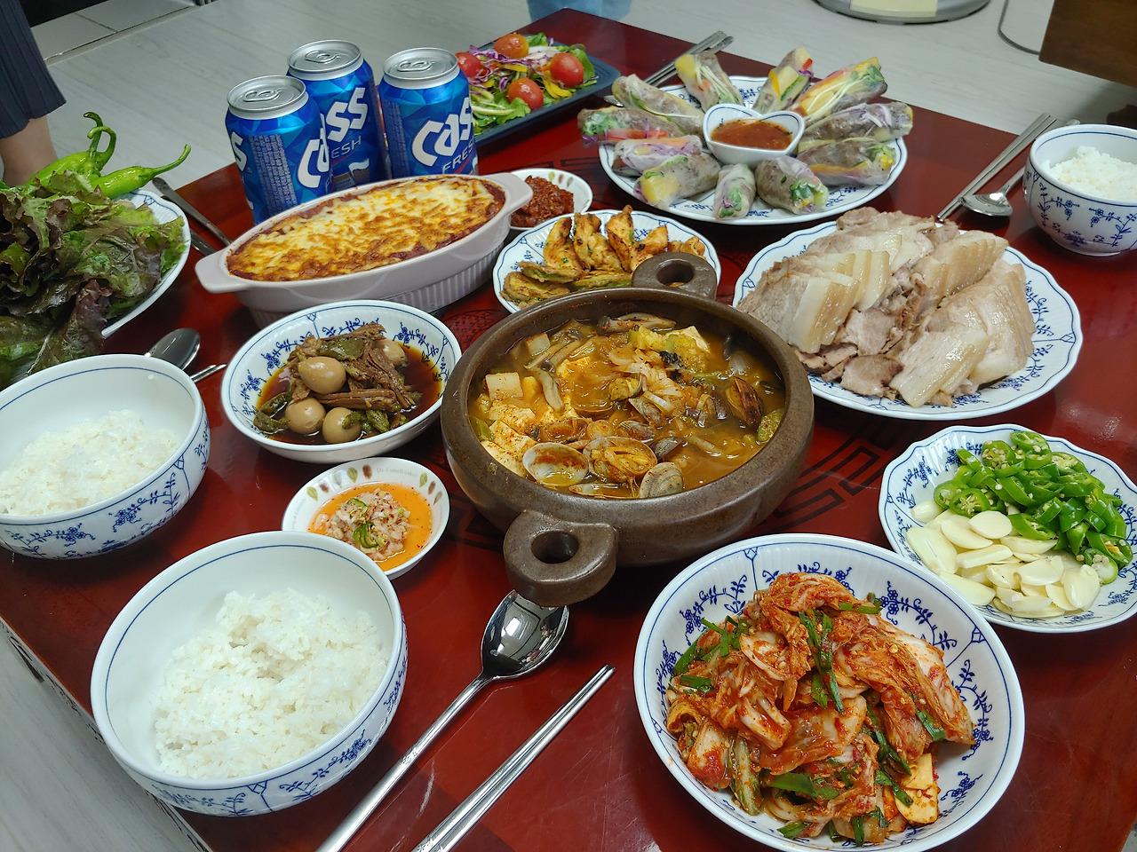 이렇게 차려놓고 입에 넣는 음식의 순서를 달리 해가면서 먹으면 행복하다. 수저가 여러 군데 왔다 갔다 하며 그릇에 닿으면서 칭칭~ 소리가 나야 밥을 맛있게 먹는 것 같다. 여기에 음식과 잘 어울리는 술이나 음료를 곁들여서 먹으면 매 끼니마다 파티하는 느낌이 난다. 세상에나 글을 적으면서도 맛있네.