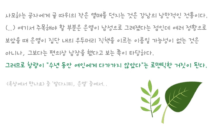 사모하는 공자에게 귤 따위의 작은 열매를 던지는 것은 강남의 낭만적인 전통이다. (…) 어쨌든 여기서 주목해야 할 부분은 은열이 남성으로 그려졌다는 점인데 여러 정황으로 보았을 때 은열이 집단 내의 우두머리 직책을 이르는 이름일 가능성이 없는 것은 아니나, 그보다는 편의상 남장을 했다고 보는 쪽이 타당하다. 그러므로 창량이 "수년 동안 여인에게 다가가지 않았다"는 로맨틱한 거짓이 된다. (p.74)