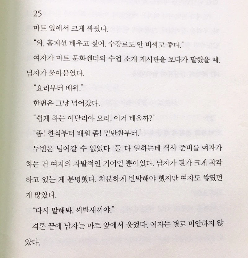 "결혼이 부동산으로 유지되는 거란 생각을 했어. 도무지 감당이 안되는 금액의 집을 사고, 같이 갚으면서 유지되었을 뿐인 게 아닐까." (p.222)