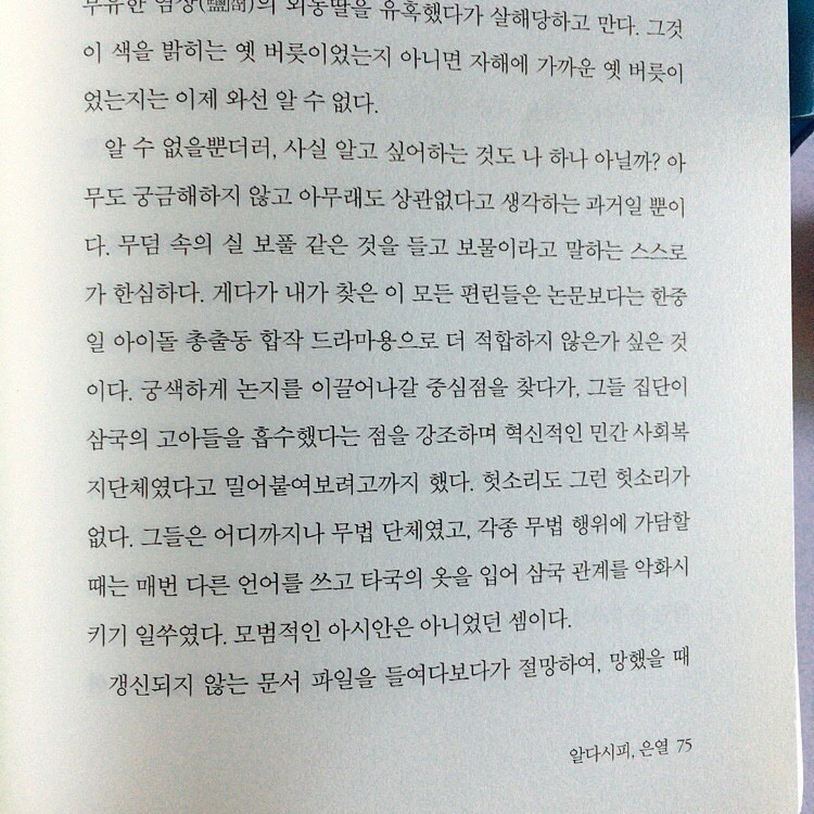 사실 알고 싶어하는 것도 나 하나 아닐까? 아무도 궁금해하지 않고 아무래도 상관없다고 생각하는 과거일 뿐이다. 무덤 속의 실 보풀 같은 것을 들고 보물이라고 말하는 스스로가 한심하다. 게다가 내가 찾은 이 모든 편린들은 논문보다는 한중일 아이돌 총출동 합작 드라마용으로 더 적합하지 않은가. (p.75)