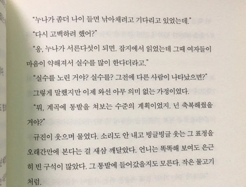누나한테 고백하려고 했는데. 처음 고백했던 스물 두 살 풋내기가 아니니까 어쩌면 지금의 나는 누나에게 괜찮은 사람으로 보일 수도 있는건데. 조금 더 나이를 먹고 사회가 누나에게 불안하라는 시선을 자꾸 보내오면 그 때 다시 고백하려고 했었는데. 그러면 누나가 '나를 선택하는' 실수를 어쩌면 해 줄 수도 있었는데..
