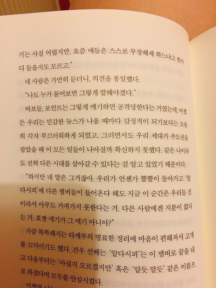 남보다 못한 가족들과도 어떻게든 연을 이어가려고 애쓰고, 처음 하기로 마음먹은 일을 끝까지 해내고, 지옥 같은 회사를 개선시키고, 성격이 안 맞는 애인과 다투고 다퉈서는 안정적인 관계에 다다르지. 그런 사람들을 좋아해. 그런 사람들처럼 살고 싶었어.