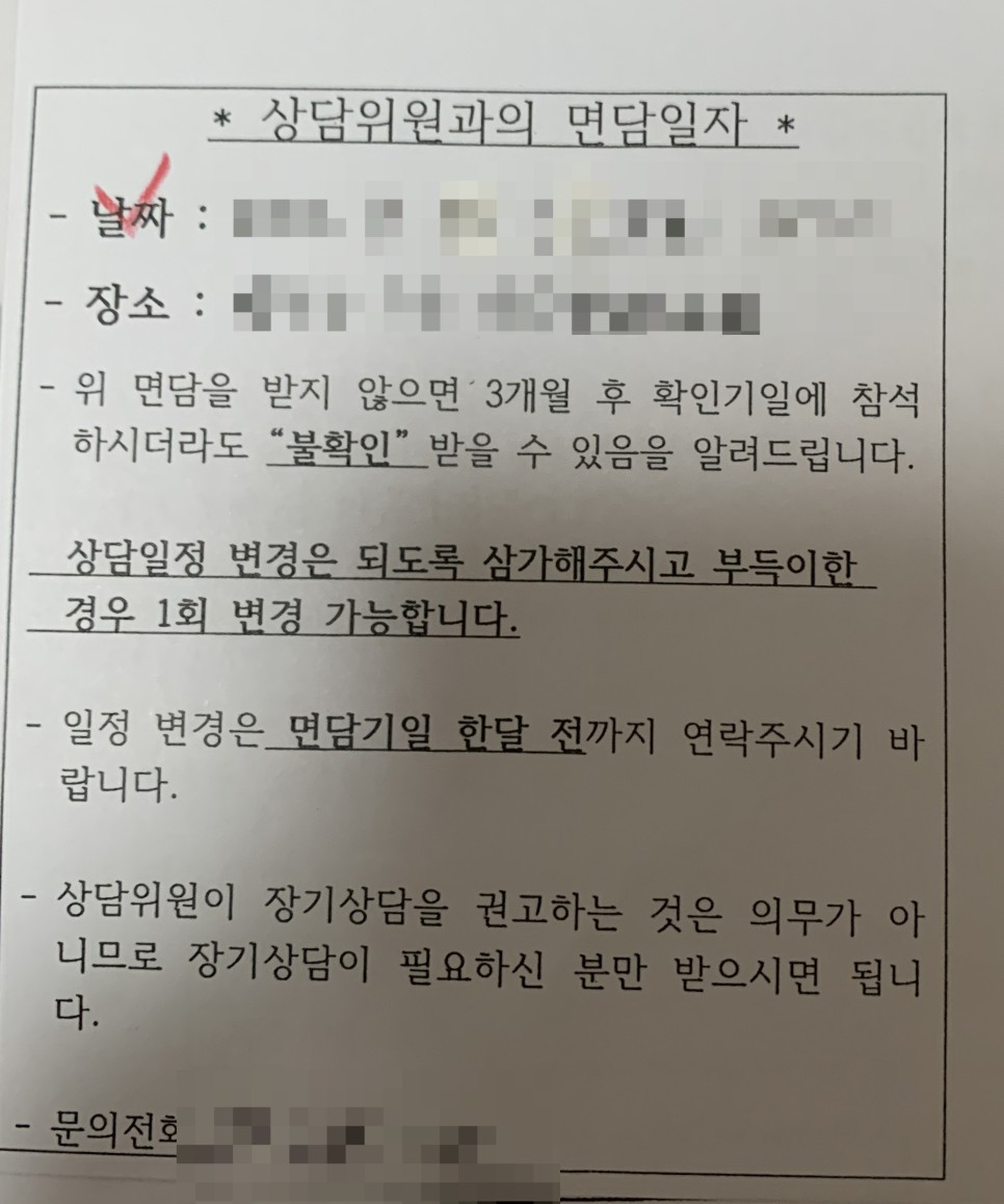 가정법원에 이혼 서류를 제출하자 상담위원과의 면담을 잡아주었다. 이제 와서 무슨 면담이 필요할까 싶었고 또 조퇴를 해야 되는 상황에서 무엇을 핑계로 해야 하나 고민했다. 집으로 돌아와 다이어리에 날짜를 적어놓고 상담 전 작성해야 할 내용에 대해 작성했다. 이혼사유는 폭언, 성격차이, 고부갈등, 외도, 경제적 사유 모두에 체크했다. 각각 문제가 터진 시기는 다르지만 결국 모두에 해당됐다. 이혼할 때 사유는 그 하나의 사유만 있을 수 없다. 그 이혼 서류를 작성하기까지 곪아 터지는 문제와 새로 생기는 문제를 덮고 또 덮어가며 어떻게든 버티기 때문이겠지.