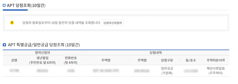 그리고 결과 발표의 날. 00:00에 발표가 난다고 하여 그때를 기다리는 사람들도 있었지만 나는 푹잤다. 이런 결과를 기다릴 때는 불합격이나 당첨되지 않은 상태를 확인하는 것보다는 차라리 그냥 결과가 어떨지 설레 하는 시간을 오래 가지는 편이 좋다. 그리고 아침에 일어나 확인을 해보니 당첨! 처음 넣은 청약에 바로 당첨이 되다니! 당첨사실을 알아마자 대출이며, 아이 공부할 곳, 직장 등등 여러 가지 생각해야 할 거리들이 넘쳐났다.
