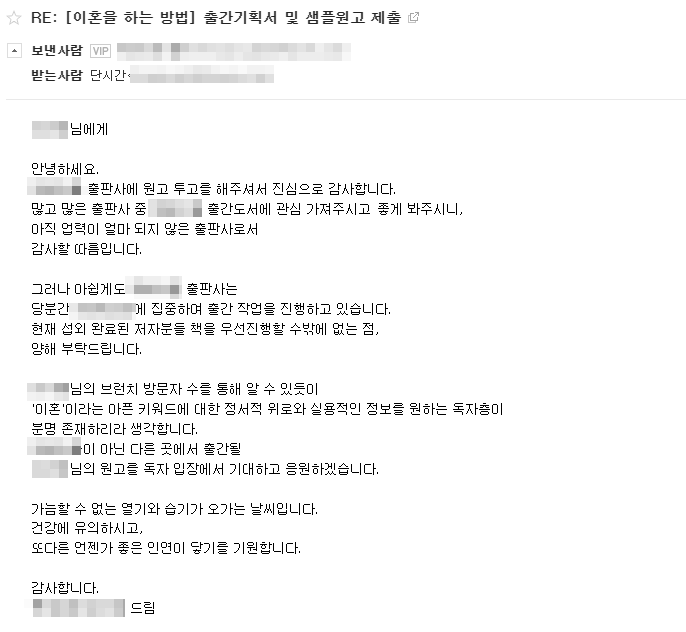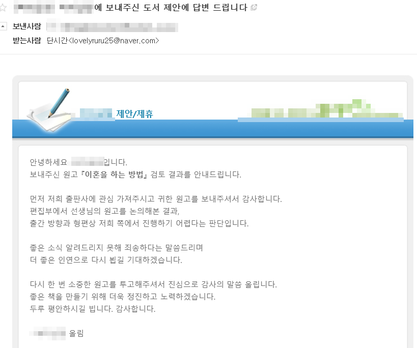 구글에서 검색해 출간기획서 몇개를 다운받아 내가 보기 좋은 형식으로 편집을 했다. 처음 써보는 출간기획서라 갈피를 잡지 못했지만 그래도 솔직하게 몇몇 문장을 담았다. 출간기획서를 쓰며 어떤 유명인들은 출판사로부터 책을 써달라는 섭외 요청에 출간을 하는 경우도 있다던데 부럽기도 했다. 출간기획서를 완성해 나름 이혼주제로 출판을 했거나 에세이를 취급하는 출판사에게 보냈더니 3곳에서 답장이 왔다. 거절이었다.