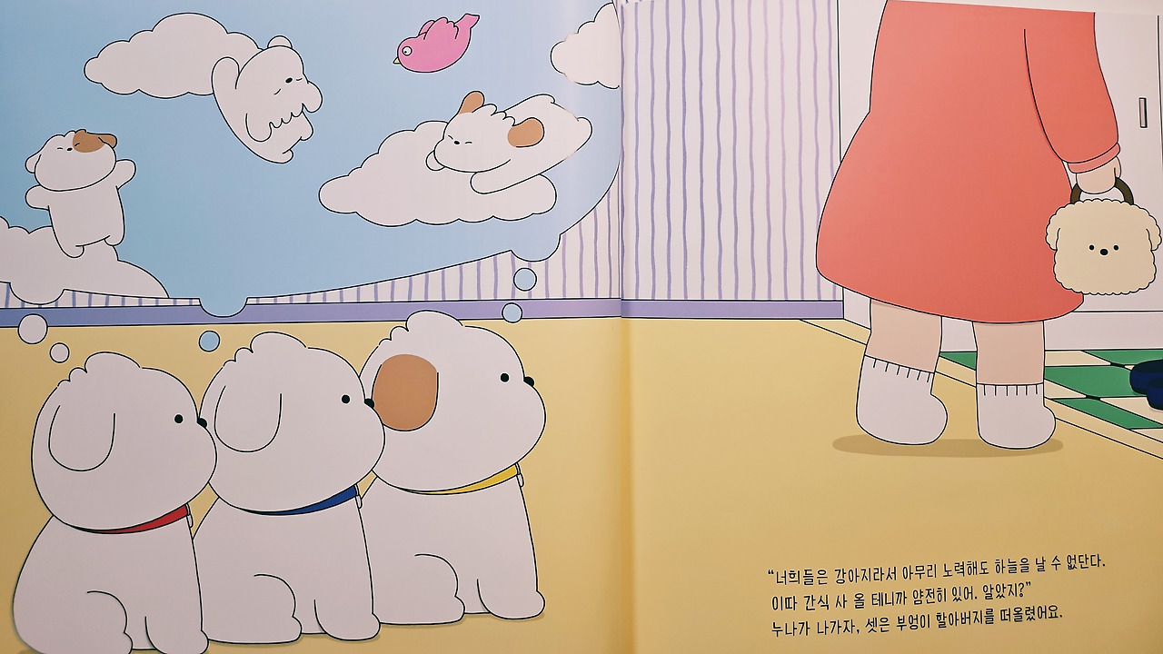 오늘 가져온에서는 제목 그대로 하늘을 날고 싶은 강아지 3남매가 등장한다. 하늘을 나는 새처럼 날고 싶은 루루 리리 라라는 마을에서 제일 똑똑한 부엉이 할아버지를 찾아가 날 수 있는 방법을 물어본다. 과연 강아지들은 하늘을 날 수 있을까.