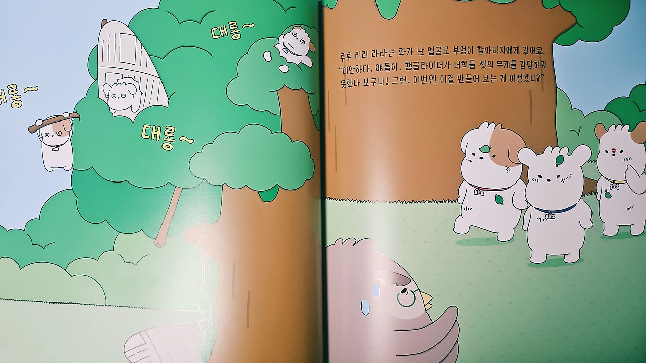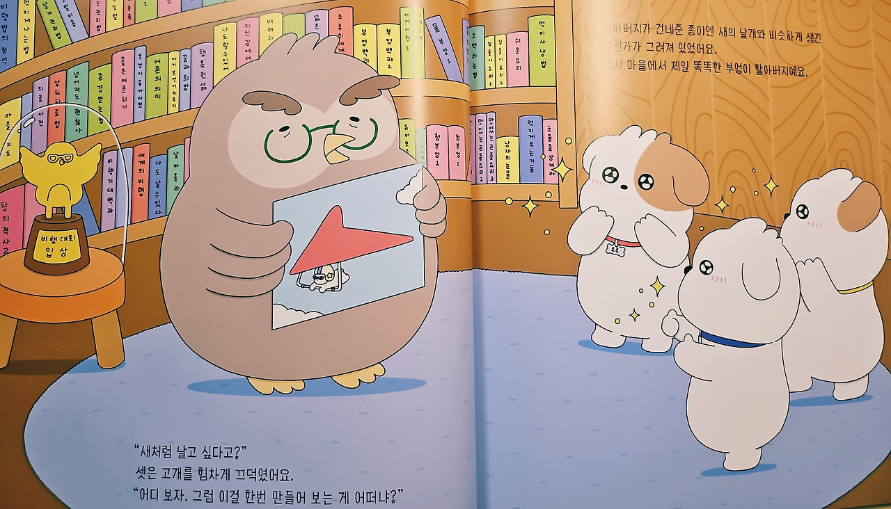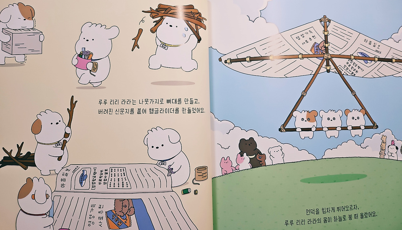 강아지 3남매는 하늘을 날기 위해 부엉이 할아버지가 알려준 행글라이더를 만들기도 하고, 열기구를 만들기도 한다. 비록 모두 실패하긴 했지만.