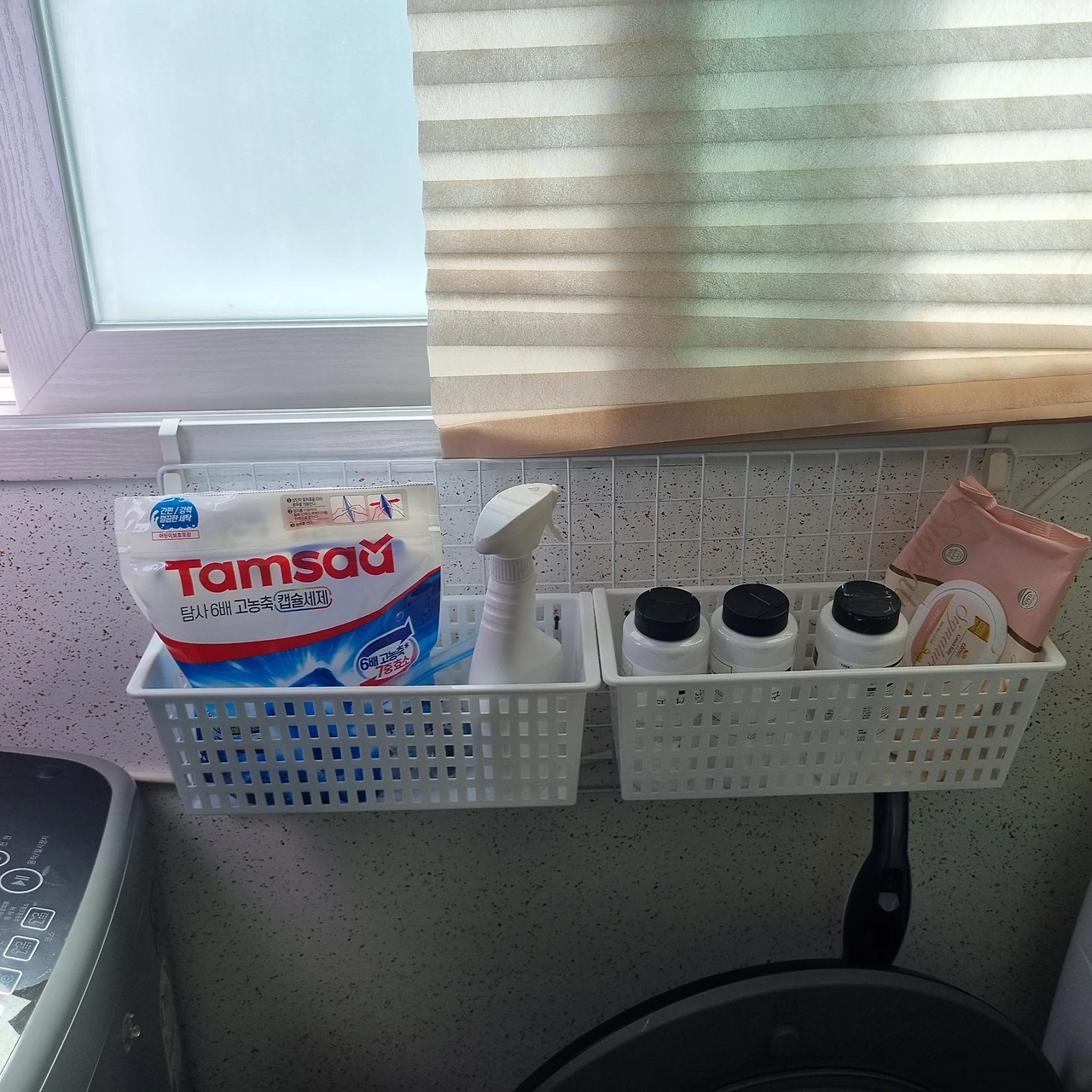 그 위쪽을 보면 창틀에 선반을 설치해서 세탁용품을 놓고 사용중이다.