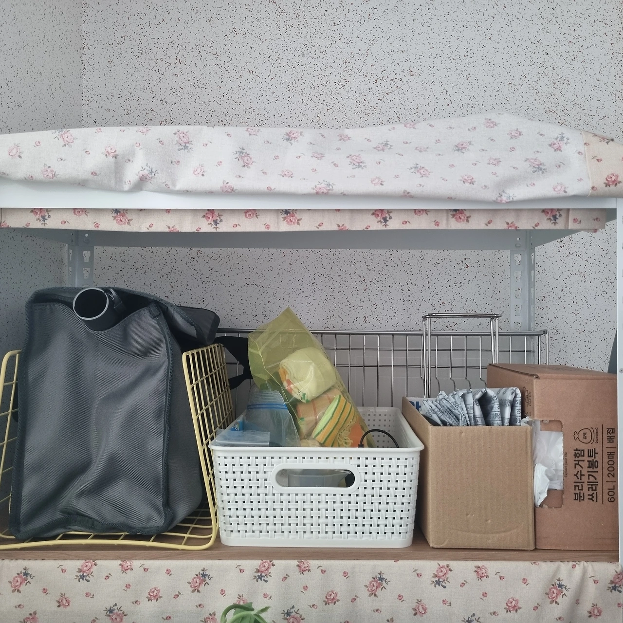 설치한 선반은 원래 화장실 문앞에 수건선반으로 만들어 사용했던 네트망과 수납바구니를 분해 후 재조립해서 만든 것이다. 결과적으로 내가 원하는 길이, 크기로 만들어 만족하며 사용중이다.