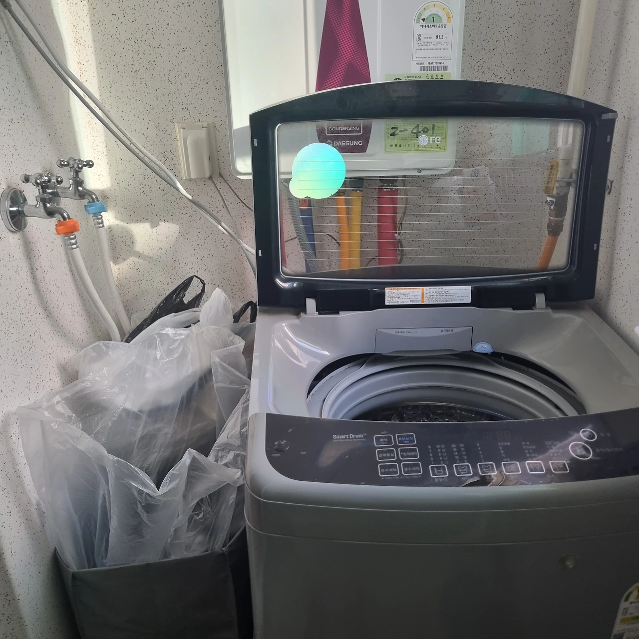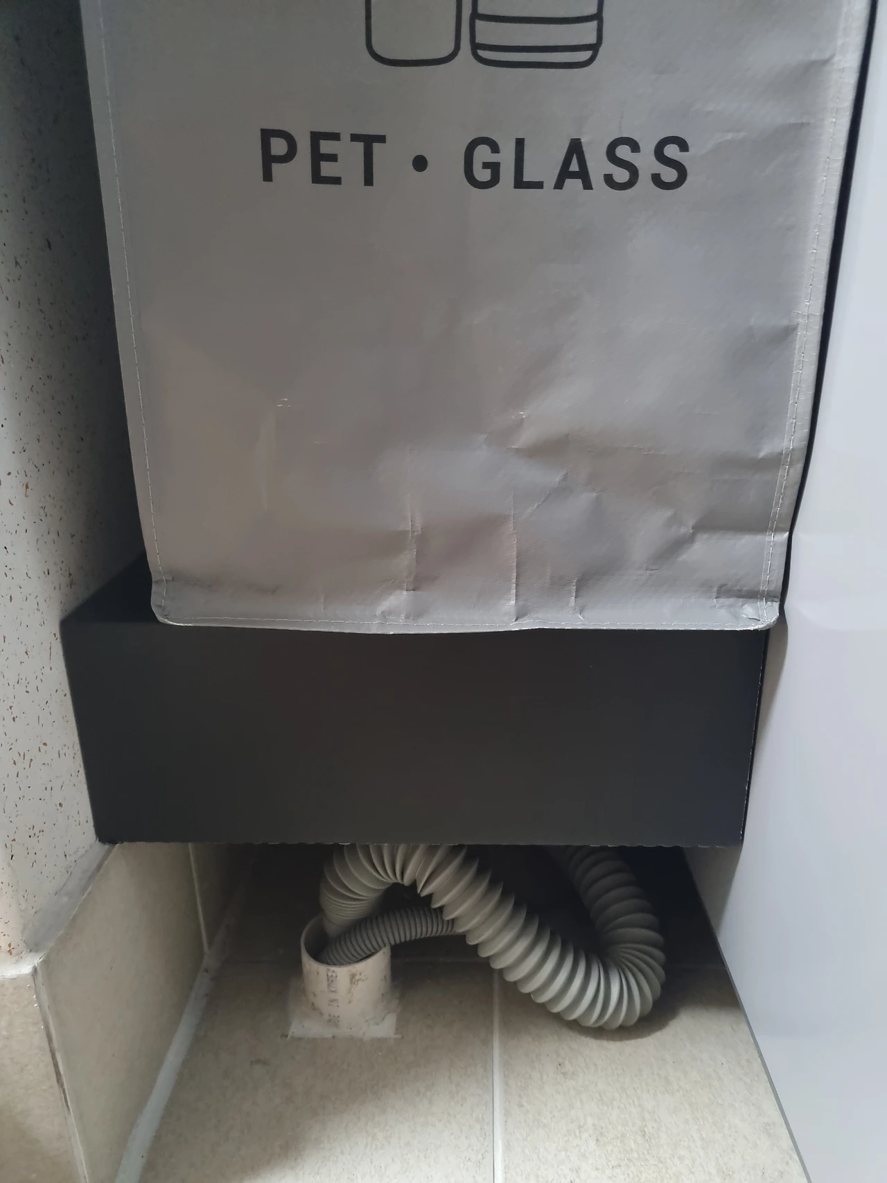 처음엔 바닥에 분리수거함을 두었는데, 세탁기 호스가 들어가는 배수구가 너무 돌출되어 있다 보니, 재활용품이 조금 차면 한쪽으로 무게가 쏠려 기우뚱했다. 그래서 세탁기와 벽 사이에 과일상자를 껴놓고 그 위에 분리수거함을 두고 사용 중이다.