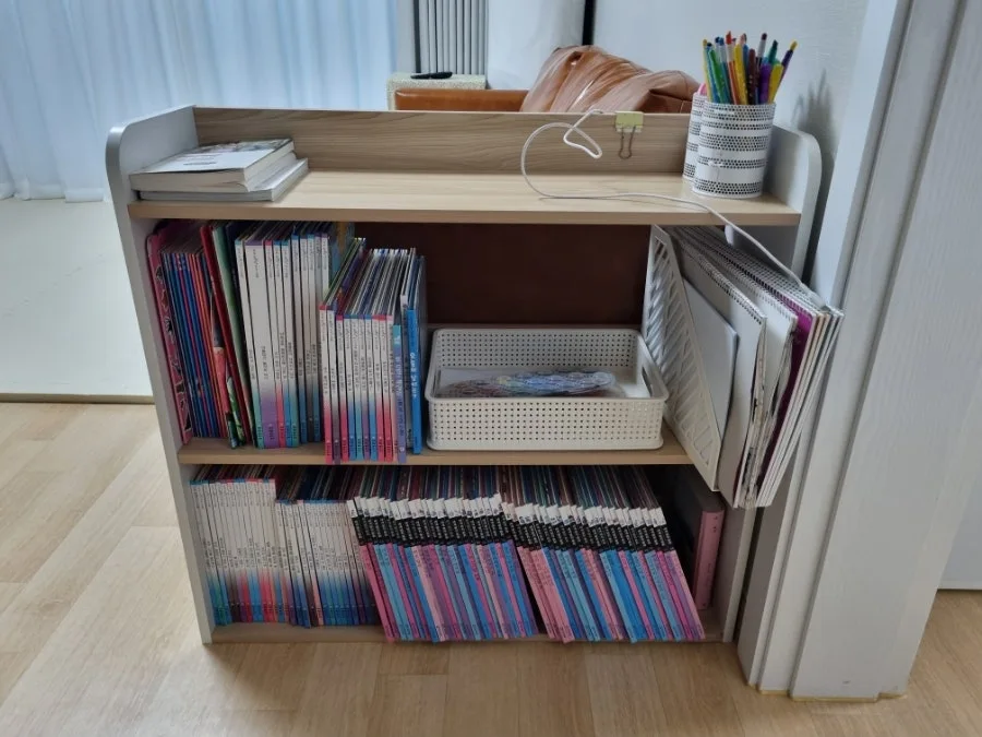 또. 중간에 칸막이가 없다 보니 아이들이 책을 꽂을 때 잘못하면 주변 책들이 무더기로 쓰러지기도 한다. 중간중간 북스탠드를 끼워두긴 했지만, 일단 한 칸에 책이 90% 이상 채워져 있어야 이용이 불편하지 않다.