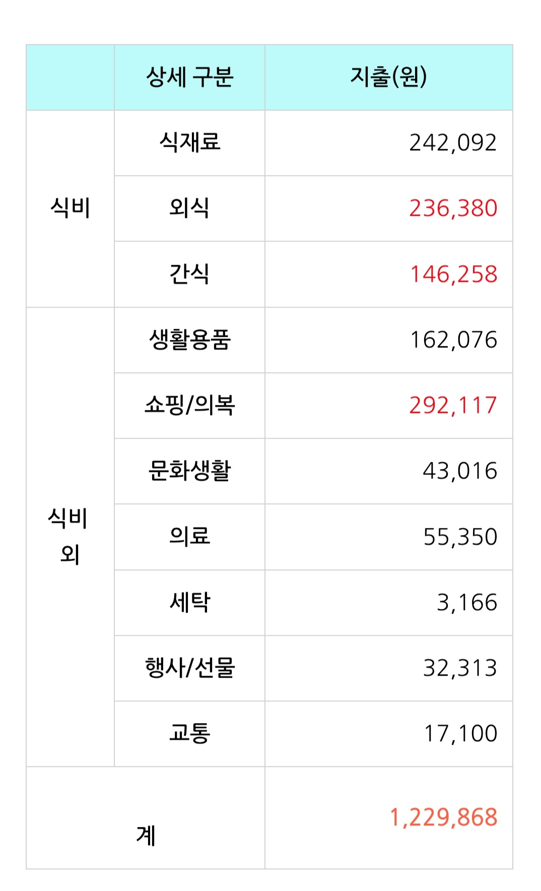 아무래도 금액만 봤을 땐 외식, 간식, 쇼핑/의복 지출에서 오버 지출의 원인을 찾을 수 있을 것 같다.