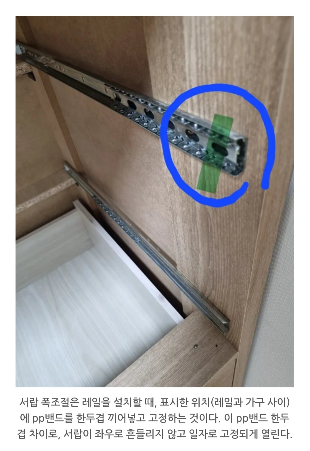 수평도 맞춰야 하고, 서랍을 열었을 때 헐겁지 않으면서도 너무 뻑뻑하지도 않게 일자로 쭉 나올 수 있도록 적당한 폭으로 조정하는 작업도 필요했다.