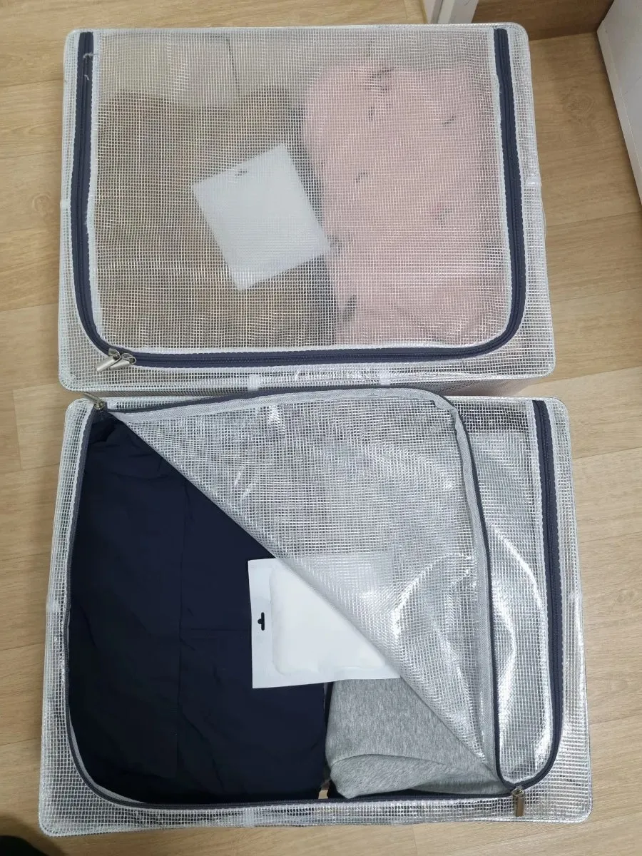 잘 개어 넣은 이불 위엔 제습제를 하나씩 얹어 지퍼를 닫아줬다. 다시 만날 때까지 뽀송해야 한다~