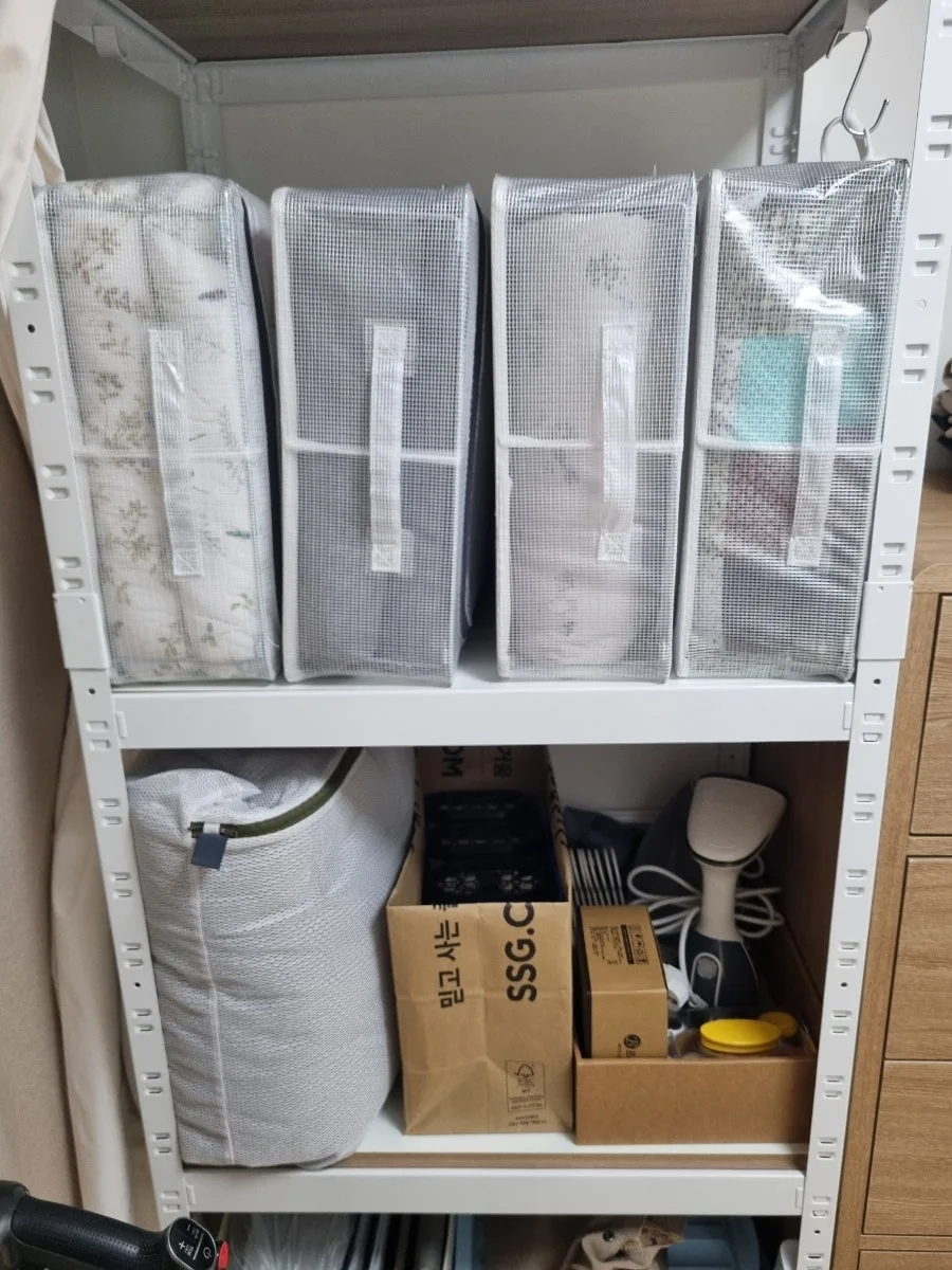 예전엔 옷장에도 보관해 봤지만 옷 걸 공간도 부족한지라, 현재는 다용도 수납함에 넣어 선반에 보관 중이다.