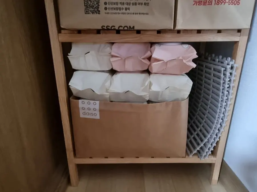 휴지와 물티슈를 보관하는 쇼핑백 각각에 받침으로 잘라 넣어줬다.