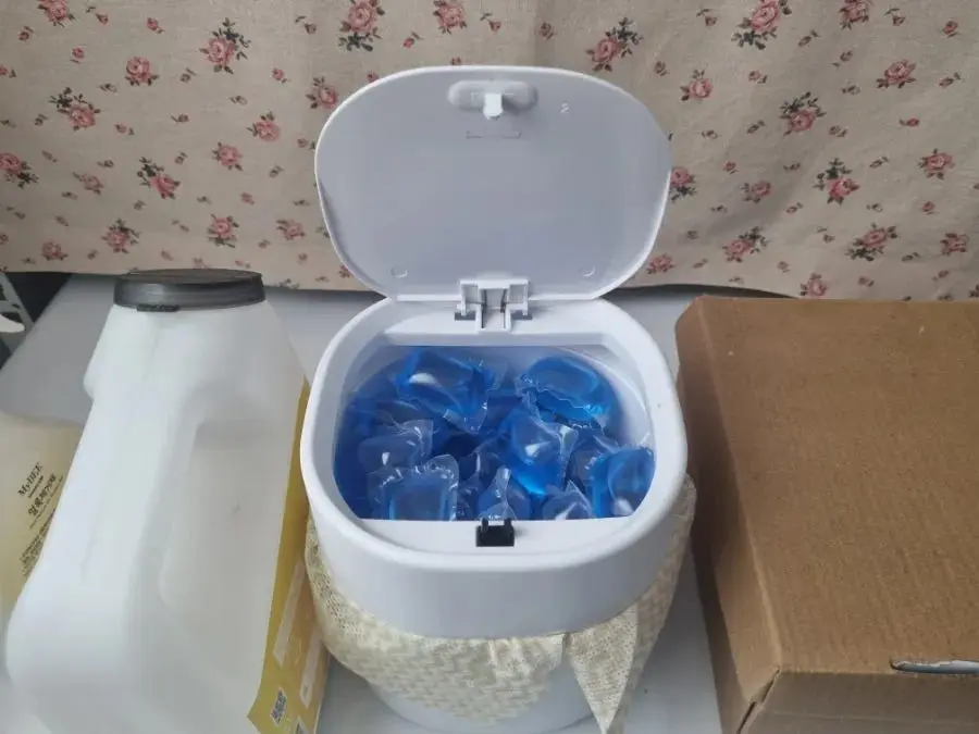 쓰레기를 채우던 휴지통이 깨끗함 그 자체인 세탁세제 보관 용기로 탈바꿈하고,