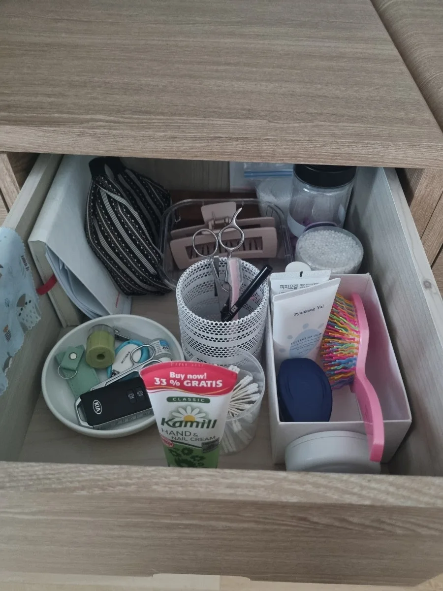 다음으로는, 옷방 서랍장 위 물건들을 정리했다.