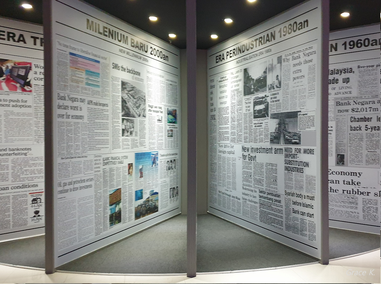 Economic Gallery는 말레이시아 근현대의 경제적 변화와 발전, 어떻게 금융시스템과 경제시스템이 발전해왔는지 등을 보여주는 곳이었다. 여기를 가장 마지막에 들렀는데 관람한 지 거의 2시간이 되어가는 시점이라 솔직히 다른 전시관보다 꼼꼼히 보지는 못했다. 다리도 아프고, 당도 떨어지고 있던 참이라.. 그렇지만 몇몇 전시물은 인상적으로 기억에 남았다. 책의 페이지처럼 생긴 것에 신문의 내용이 담겨 있는 것이라든가(Giant Newspaper cutting). 인터뷰 영상 등. 지루할 수 있는 주제의 내용들을 다양하게 소개하려는 노력이 엿보이는 전시관이었다.