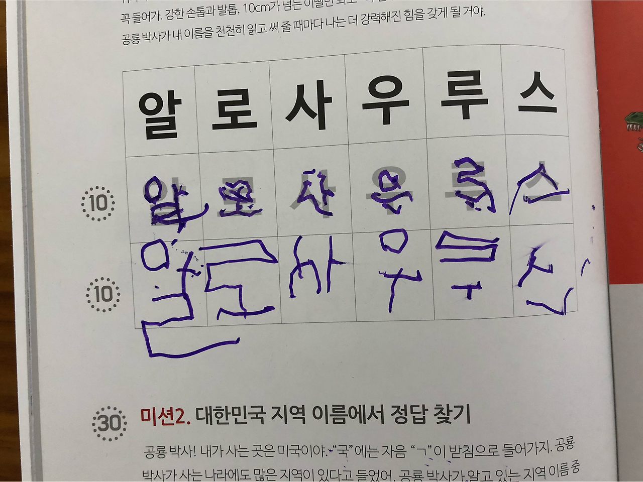 즐거움은 오래가지 않으며 즐거움만 있는 건 더욱 아니다. 하루의 일과를 끝내고 양치질만을 남겨둔 상황에서 한글 공부 교재를 모조리 꺼내어 하자는 통에 참을 인을 그었고, 여러 번 알려주어도 ‘ㄹ’을 ‘5’로 썼다. 한글 알려준 적도 없었기에 그건 괜찮았지만. 책을 골라와 잠들기 직전까지 아이는 엄마와 함께하길 원했다.