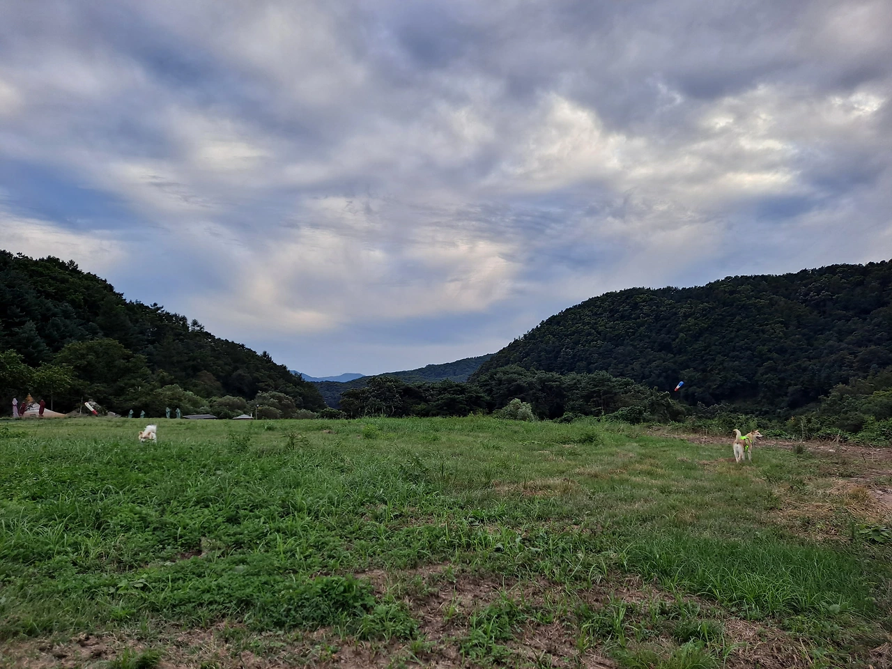 오늘도 큰아이와 나이 든 개 두 마리를 데리고 산책을 갔다 왔다. 요즘 하늘이 너무 예뻐서 어디를 찍어도 예술이다. 시골에 살면 운동을 많이 할 것 같은데 생각보다 그렇게 운동량이 많지 않은 데다가 개들도 나이가 들다 보니 움직임이 현저히 줄어들었다. 그래서 일부러 이렇게 시간을 내서 매일 산책을 나온다. 산 언덕 위 패러글라이딩 착륙장까지 올라가니 사람도 없고 바람도 시원해 개들보고 뛰어 놀라고 줄을 풀어 줬다. 마당하고 다른 환경이라 나름 멀리까지 냄새 맡으며 돌아다닌다.