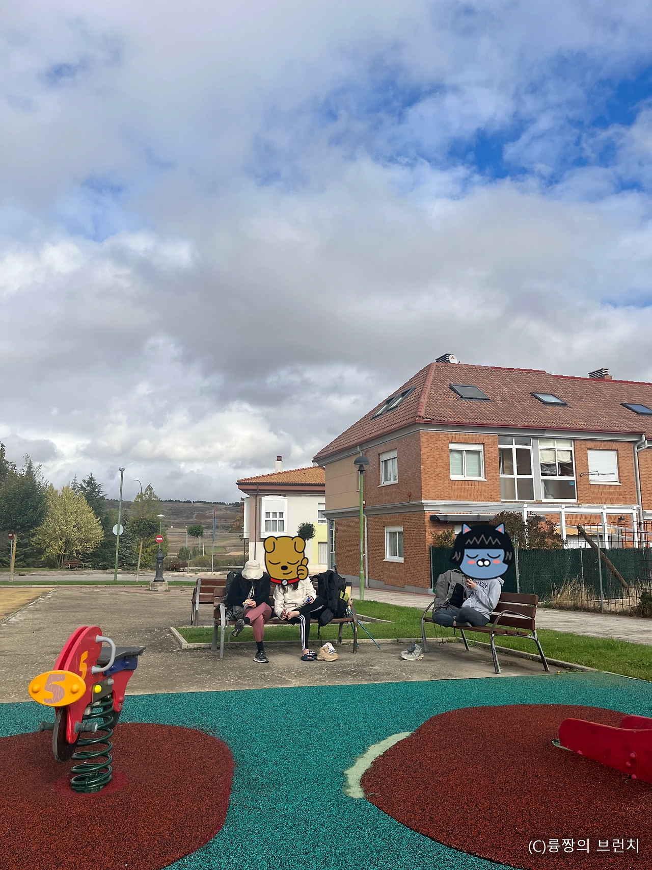 아무도 없는 작은 놀이터여서 편하게 쉬기에 너무 좋았다. 벤치에 앉아서 각자 휴식을 취했는데, 사촌 언니는 핸드폰을 했고, K언니는 발의 상태를 보며 바세린을 발랐으며, 나는 아침에 먹다 남은 바게트를 먹었다. 그런 우리의 모습을 카메라로 담은 B언니였다.