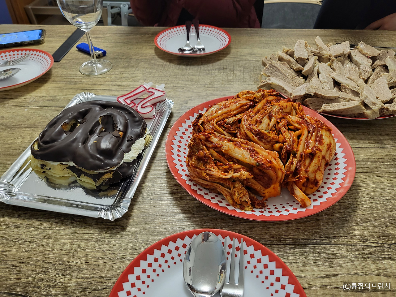 크고 네모난 식탁엔 케이크, 와인, 4개의 와인잔, 수육, 김치가 가득했다. 제대로 김치를 만들고 싶다는 N언니의 소원이 여기서 이루어지게 된 것이었다. 솜씨 좋은 N언니가 전날부터 절여놓은 배추에 김치 양념을 쓱- 발라 무친 먹음직스러운 김치였다. (스페인에서 김장김치를 먹을 줄이야 상상도 못 했다)