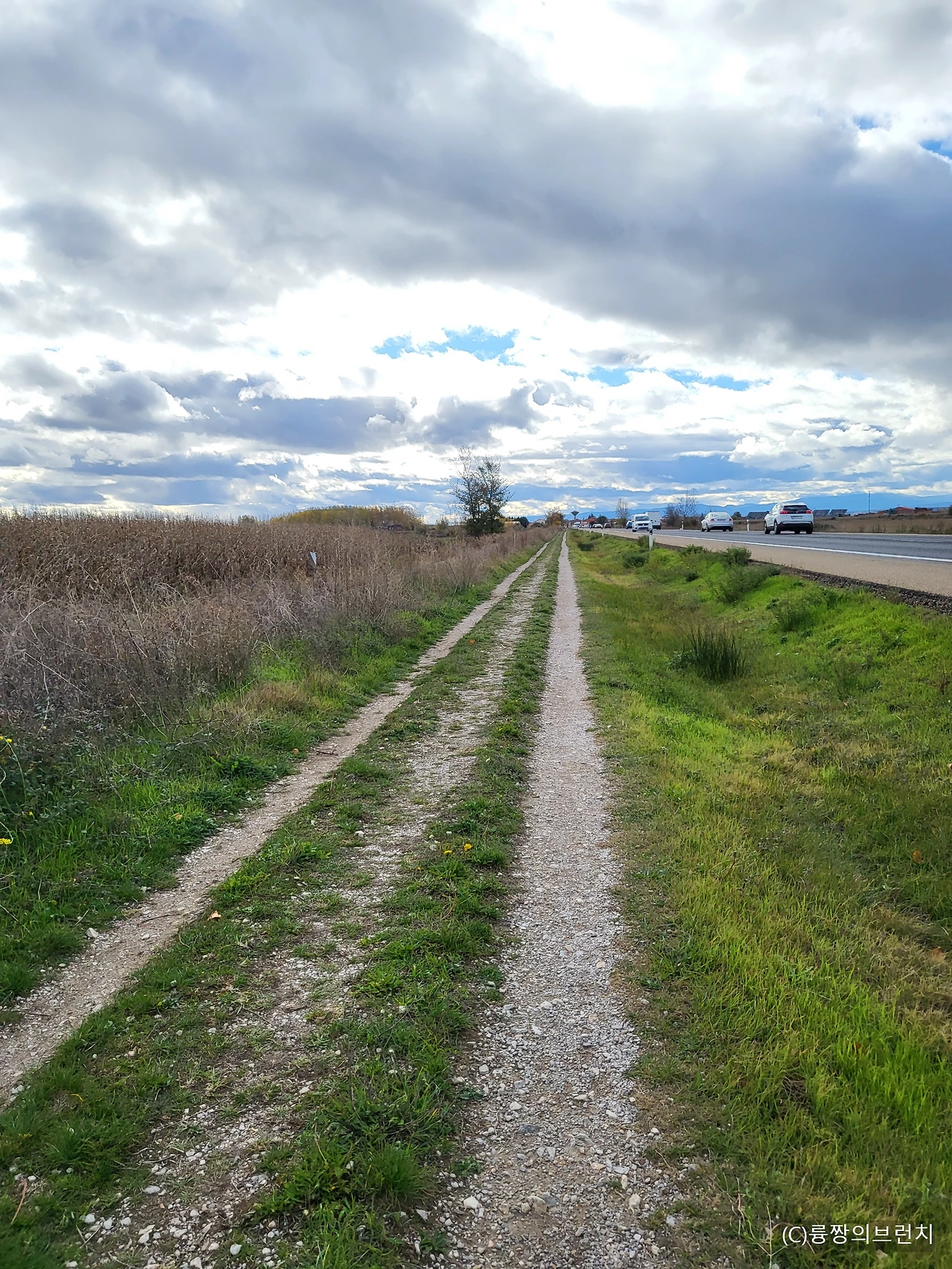 파란 하늘의 날씨는 너무 좋았지만, 숙소까지 남은 길에는 큰 마을들이 없어서 쉬는 것이 마냥 평탄하지는 않았다. 우리가 제법 꽤 많이 왔다는 생각이 들었을 때는 마침 점심시간이었다. 아침에 먹다 남은 토스트를 챙겨 온 우리는 곧바로 먹을 장소를 탐색하기 시작했다. 걸으면서 주위를 돌아보니 조그만 언덕 위 나무로 된 의자와 테이블이 보였다.