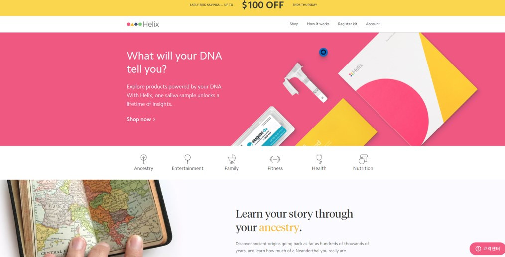 Helix는 Illumina에서 스핀오프 한 회사로써 2015년에 설립되었으며, 현재 엑솜 시퀀싱을 기반으로 조상에 대한 정보부터 유전된 콜레스테롤 및 당뇨병 위험에 대해 알려주는 등의 의사 처방전을 요구하는 건강 검사를 포함하여 30 가지 이상의 유전자 검사를 파트너들과 함께 제공하고 있습니다 (6). Helix는 개인의 DNA 샘플을 수집하고 시퀀싱 하여 DNA 데이터(유전자 분석 정보)를 저장하므로, 다른 타액 샘플을 제공하지 않고도 마켓 플레이스에서 서비스(제품)를 주문할 수 있습니다. 서비스를 주문하면 Helix는 해당 DNA 데이터를 파트너사와 공유하여 분석을 수행하게 합니다. 즉, Helix는 내부에서 제공하는 데이터만을 사용할 수 있도록 하는 닫힌 플랫폼(Closed platform) 형태의 서비스를 취하고 있습니다.