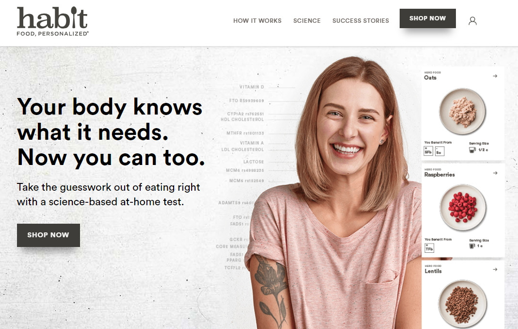Habit은 영양과 관련 있는 70여 개에 달하는 유전형 정보와 표현형 정보를 활용하여 개인화된 행동 계획과 코칭 서비스를 지원하며, 개인 맞춤 식단을 만들어 배달함으로써 개인 맞춤형 서비스에 다가서고 있다 (1). 이러한 프로세스는 유전/표현형의 결과를 머신러닝 알고리즘을 통해 분석하여 사용자의 이상적인 식단을 결정하게 되고, 이를 바탕으로 다이어트 코치와 맞춤형 식단 배달 서비스를 제공하고 있다. 또한, 사용자의 진행 상황에 대한 모니터링과 관련 소셜 네트워킹을 할 수 있도록 앱 서비스를 제공하며, 꾸준히 사용자들이 정보를 활용할 수 있도록 유도하고 있다. 더불어, 과학적 증거를 바탕으로 사업을 보완하기 위해 Habit은 유럽의 독립 연구기관인 TNO와 파트너 관계를 맺었으며, CLIA 인증 실험실과 함께 과학 자문위원회 등을 활용하고 있다.