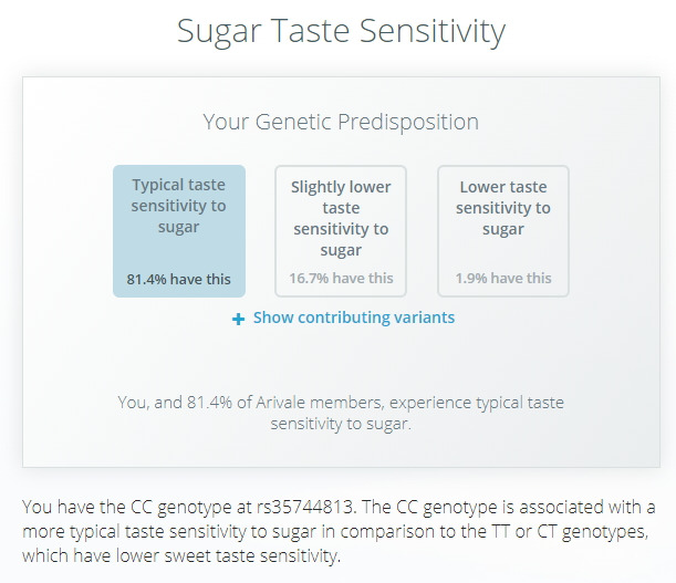 Arivale은 DNA, 혈액, 마이크로바이옴 분석 결과와 라이프로그를 기록할 수 있는 웨어러블 디바이스를 제공하고 있다 (2). 외부 임상 파트너사인 LabCorp에 의해 유전형과 표현형 데이터들이 분석되고, Fitbit으로부터 얻어지는 라이프로그 데이터(활동, 심박, 수면 등)들이 Dashboard를 통해 연결되어 사용자에게 건강한 삶을 영위할 수 있도록 통합적인 데이터를 제공한다. 또한, 사용자는 앱을 다운로드하고 온라인 평가를 완료하여 목표, 건강 기록 및 라이프 스타일, 스트레스 수준, 성격 및 행복을 공유할 수 있도록 하였으며, 이를 통해 코치와 쉽게 의사소통을 하고, 지속적으로 상태를 자각할 수 있도록 하여 습관을 변화시킬 수 있도록 서비스를 제공하고 있다. 이들의 사업 방향은 각 사용자 별로 개인화된 데이터 클라우드를 만들어 서비스를 진행해 주는 것으로 보여, 향후 빅데이터와 AI를 활용한 서비스로 발전할 것으로 예상된다. 필자는 가장 기본적인 Arivale의 DNA 유전자 검사를 의뢰하여 다이어트와 관련된 정보를 가지고 있다. 한 가지 검사 결과를 살펴보면, 유전적으로 당 감수성이 높음을 알 수 있다. 즉, 다른 사람들보다 만족감을 충족시키기 위해 더 많은 설탕이 필요할 수 있음을 뜻하는 것이다. 아쉽게도 Arivale의 코칭 서비스는 지리적 한계 때문에 받을 수는 없지만, 아마 이러한 유전적 요소들을 고려하여 영양에 대한 서비스를 진행하지 않을까 생각된다.