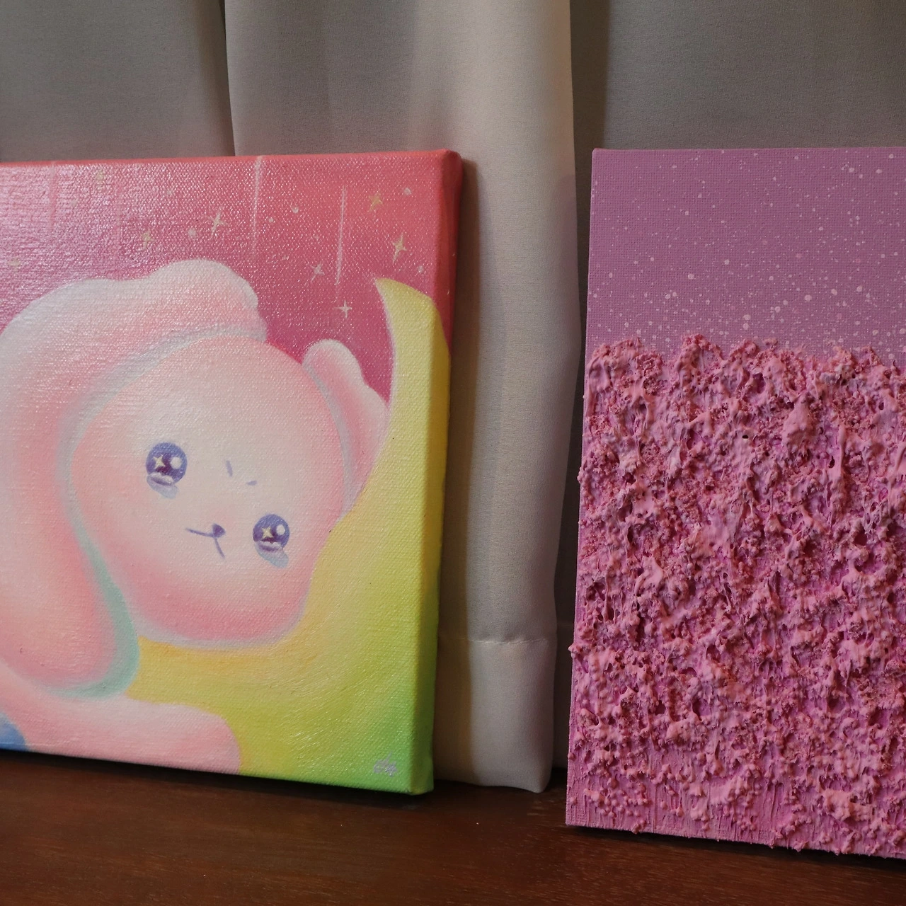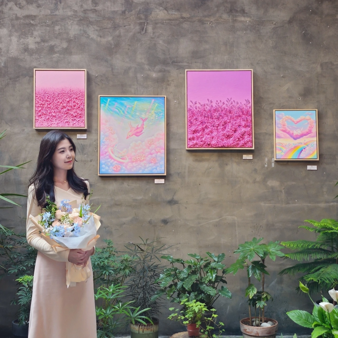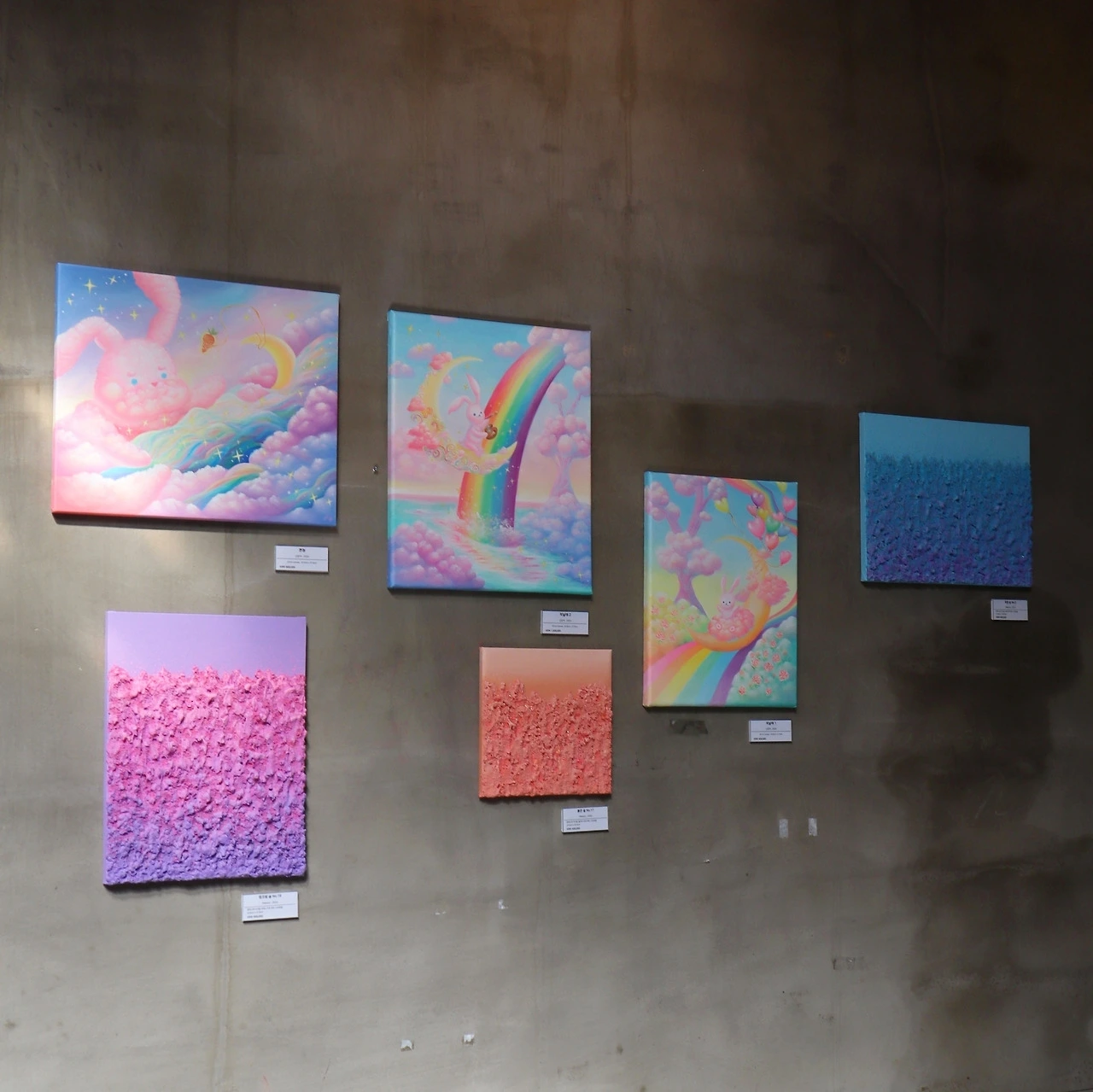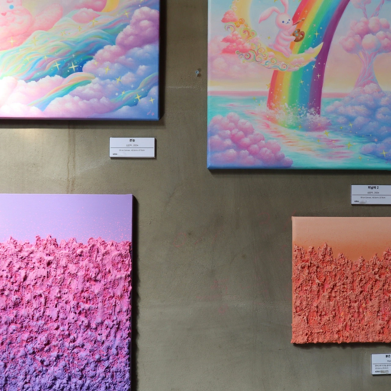 전시를 준비하면서 우린 서로의 작업에 대한 이야기를 나눴다. 나는 귀여운 상상으로 동화 같은 이미지를 구현하고 작가님은 강렬하면서 화려한 분위기를 추상적으로 제시한다. 우린 다른 것을 그리고 있었지만 비슷한 무언가를 공유하고 있었는데 우리의 밝은 이면엔 어둠이 담겨 있었다. 우리는 슬픔, 불안, 분노, 두려움 등 부정적인 감정을 통해 성장해 왔었고 우리의 작업은 내면의 어둠을 승화시켜 사무치게 빛나는 화사함이었다. 그 과정 속에서 우리의 행복은 그동안 흘렀던 눈물만큼 짙어지고 있었다.