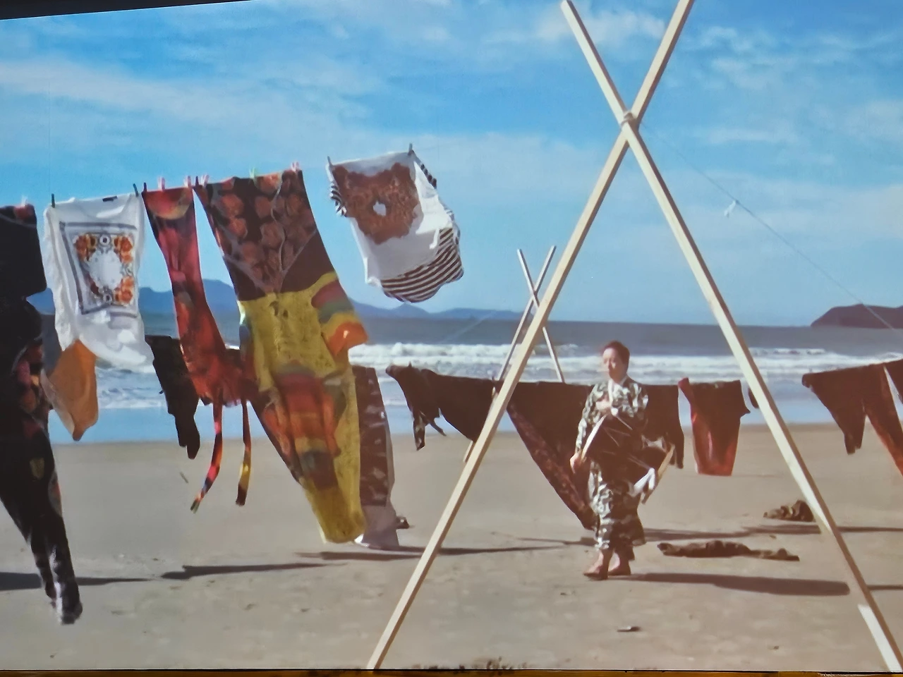 백령도에서 자신이 디자인한 옷을 입힌 무용가의 장구춤 퍼포먼스 및 설치작업이 결합된 영상물 <난무>(2009). 장구 가락과 시원한 풍경이 어우러져 청량감을 준다.